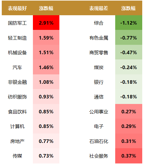 盘面上,31个申万一级行业中有25个行业上涨,其中国防军工,轻工制造,机械设备行业表现最好,涨幅分别为2.91%,1.59%,1.51%;综合,有色金属,商贸零售行业领跌,跌幅分别为1.12%,0.77%,0.47%。
