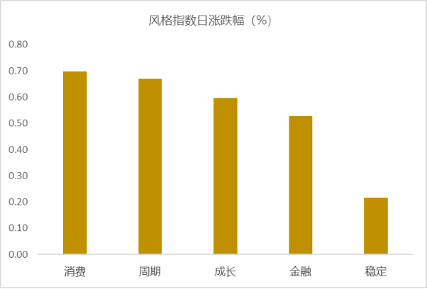 从风格指数上来看,今日各风格表现不错,其中消费风格的个股表现最好,稳定风格的个股表现最弱。近期风格转换较为明显。