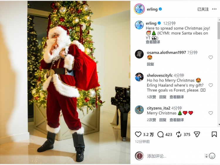 圣诞节之际,哈兰德社媒晒出装扮成圣诞老人的照片,配文:“在此传递圣诞欢乐!”