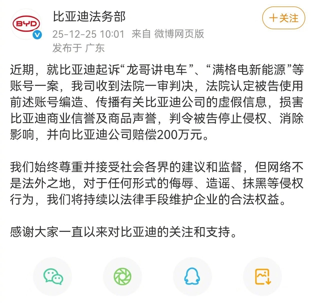 法院判决自媒体赔偿比亚迪200万元现在有些黑公关确实很讨厌 黑白颠倒不太了解的用户会直接产生错误观点基于事实的客观批评,让消费者看清产品的不足,这是有价值的参考;可是脱离实际、刻意找茬的强行指责,就明显超出了合理范畴。