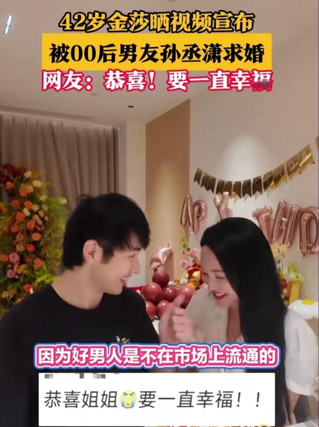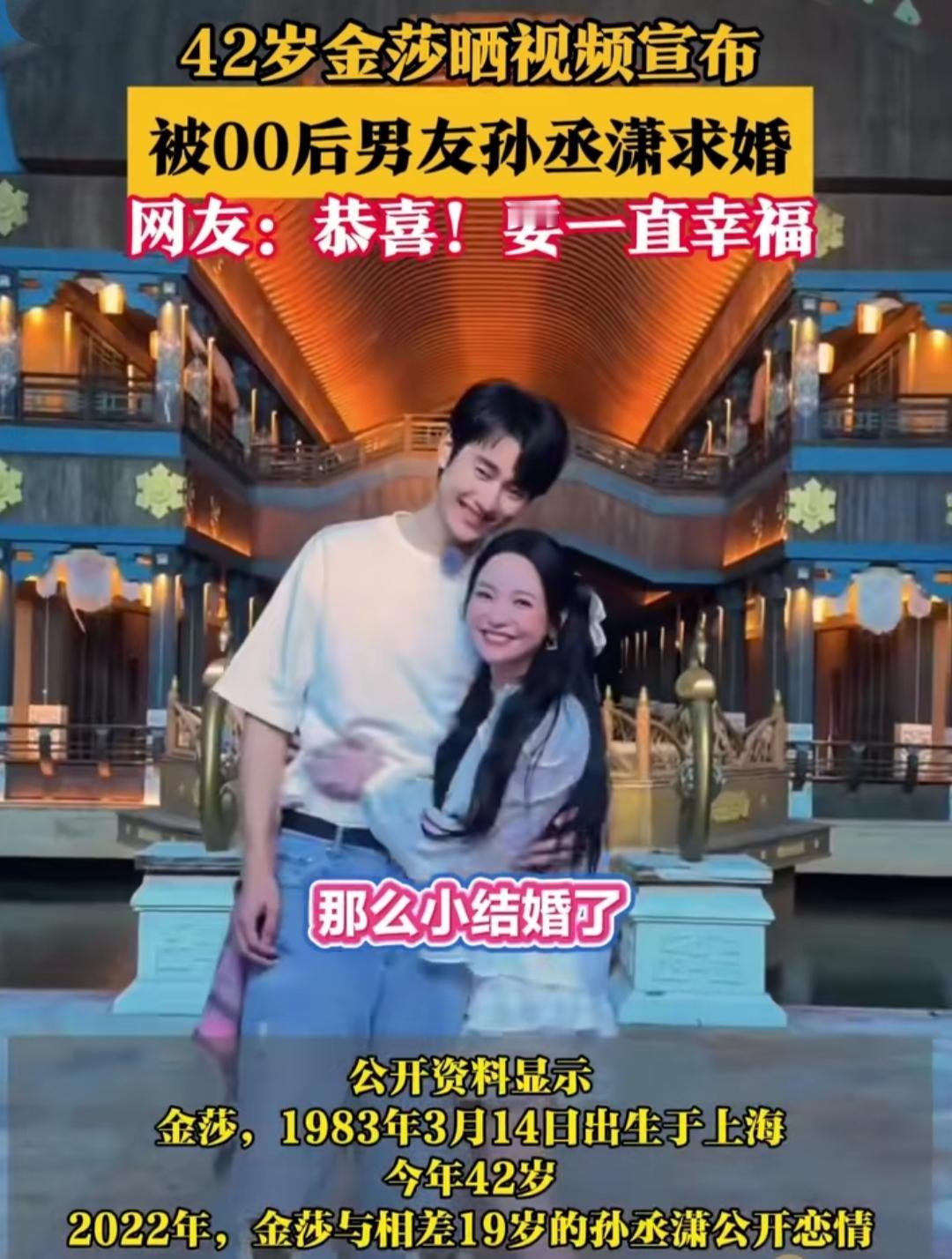 冰岛钻石沙滩的极光下,42岁金莎迎来了最美的瞬间——2025年12月23日,00后男友孙丞潇在这里向她求婚,12月24日金莎晒出视频官宣,笑着坦言“我比我男朋友大了19岁”,甜蜜藏不住。 两人2022年相识、2023年9月公开恋情,这段相差19岁的姐弟恋起初满是质疑,外界不看好的声音从未停过。可孙丞潇用三年的真心打破偏见,不仅提前三个月筹备求婚,还曾因经济差距主动提出婚前财产公证,用细节诠释了对金莎的珍视。 视频里金莎笑靥如花,孙丞潇满眼温柔,那句“好男人是不在市场上流通的”成了最戳人的告白。网友纷纷刷屏祝福,有人说“年龄从不是爱情的枷锁”,也有人感慨“金莎活成了女生羡慕的样子”。原来真正的爱情,从不在乎岁月的差距,只在乎彼此眼里的光。