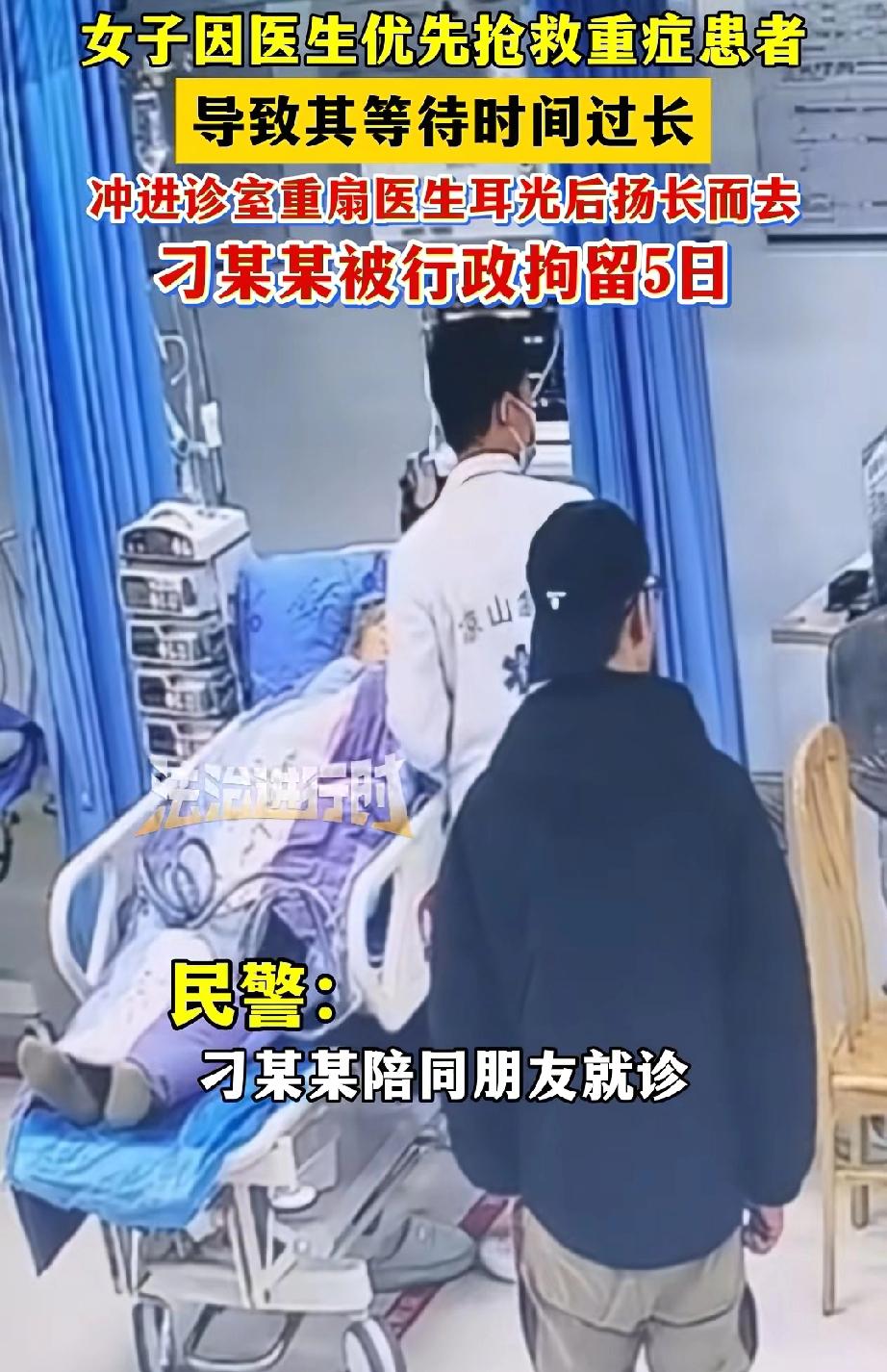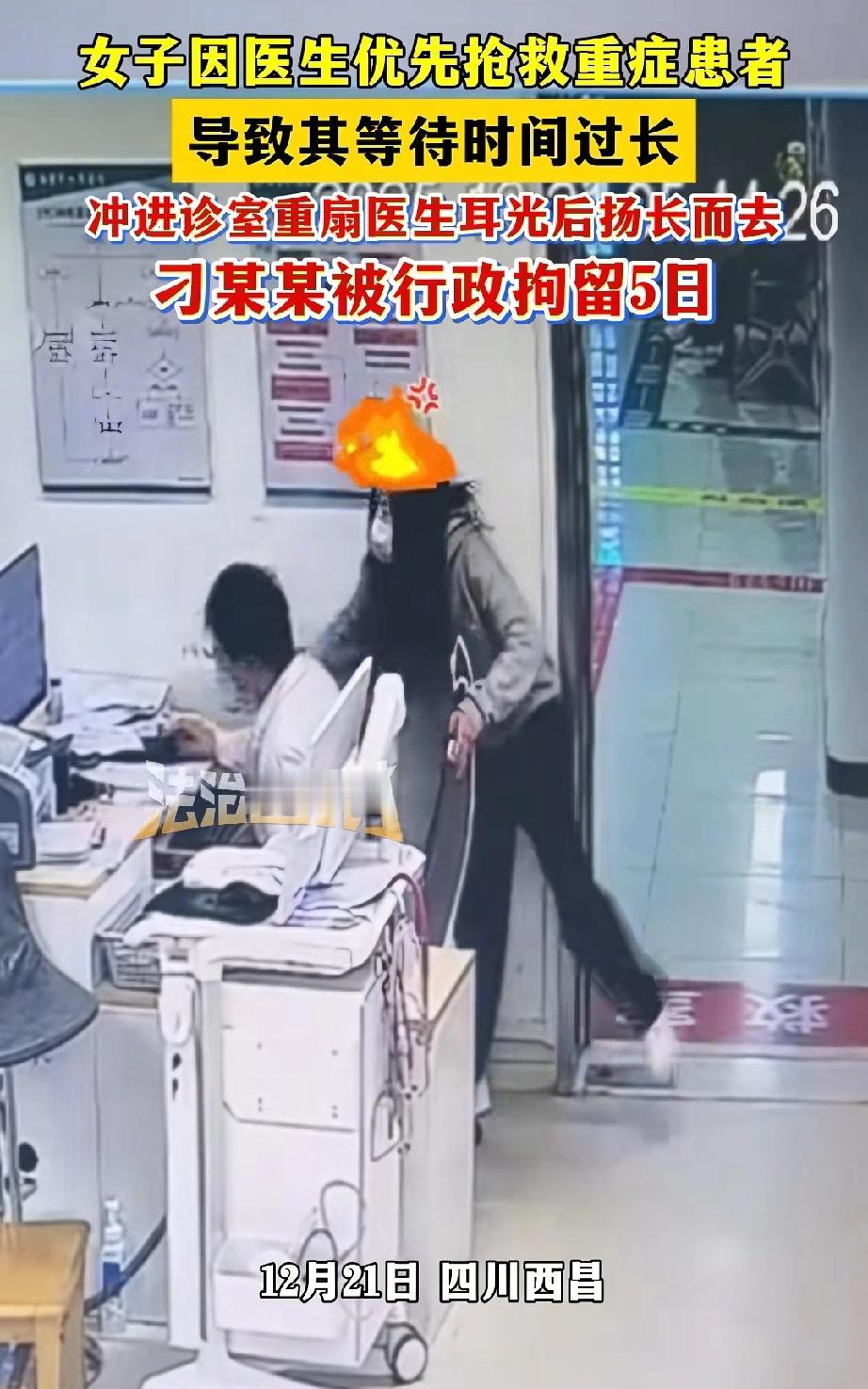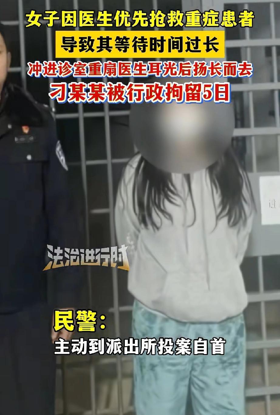 四川西昌,早晨女子正在排队就诊。轮到她时,医生却走出诊室,对排队的病人们说道:“你们稍等一下,我去看看其他病人。” 原来,有位重症病人刚刚被送到医院。 女子等得心烦意乱,误以为又是“关系户”插队。看到医生回来,她气愤地冲进诊室,一言不发,抬手就给了医生一个耳光,随后撒腿跑掉。 中午,在朋友的劝说下,女子前往派出所投案自首,最终被行政拘留五日。 医院有急症病人优先的规定,不知女子是否知晓。她本就身体不适,还如此行事,可见脾气欠佳。 情绪之中藏着健康的密码,动辄生气,实则是在损耗自己的身体。 如果女子心里常装着别人的难处,情绪自然能少几分急躁。 无论是什么关系,扇别人耳光都是不对的。一记耳光换来五天拘留,这是她必须承担的后果。 来源:法治进行时
