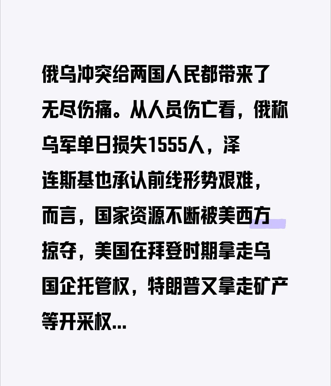 俄乌冲突给两国人民都带来了无尽伤痛。从人员伤亡看,俄称乌军单日损失1555人,泽连斯基也承认前线形势艰难,而言,国家资源不断被美西方掠夺,美国在拜登时期拿走乌国企托管权,特朗普又拿走矿产等开采权。而战争不停,民众在炮火中担惊受怕,生活难以为继。 俄罗斯民众同样不好过,战争让社会经济面临压力,无数年轻人奔赴战场,生命安全受到威胁。这场冲突背后是美西方的利益博弈,而两国人民却成了牺牲品。