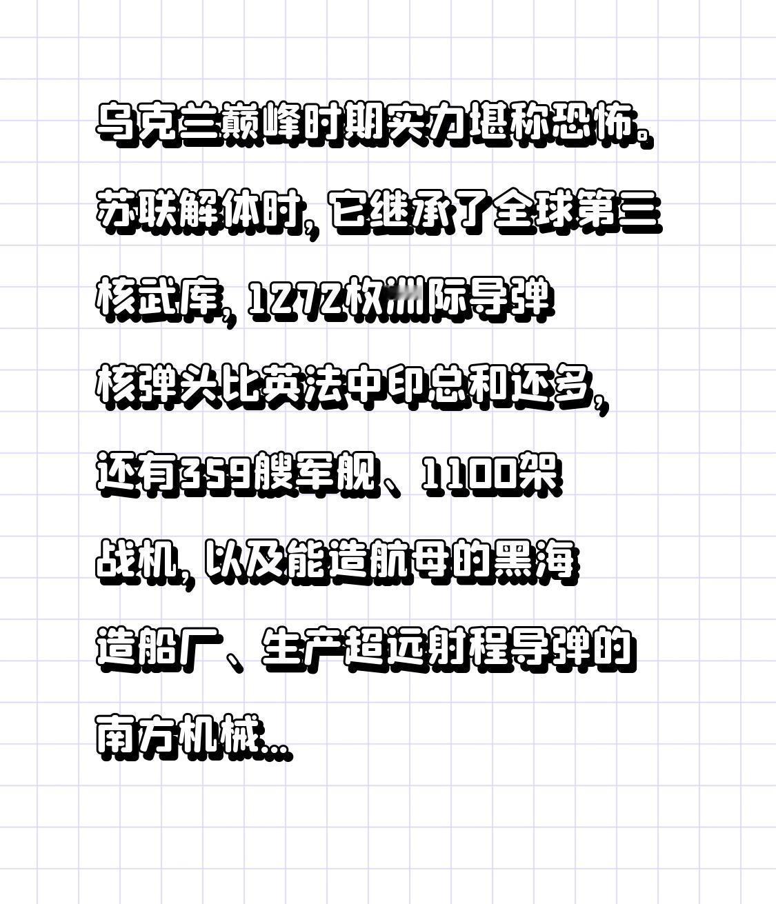 乌克兰巅峰时期实力堪称恐怖。苏联解体时,它继承了全球第三核武库,1272枚洲际导弹核弹头比英法中印总和还多,还有359艘军舰、1100架战机,以及能造航母的黑海造船厂、生产超远射程导弹的南方机械制造厂。 工业上也是东欧制造心脏,1990年钢铁产量超德国,煤炭产量欧洲第一,年产燃气轮机可装备33个航母战斗群。农业更是一绝,黑土地占全球23%,粮食人均1吨,葵花籽油出口占全球53%。其地理位置重要,是“欧洲之门”。可惜后来自废武功,实力大不如前。