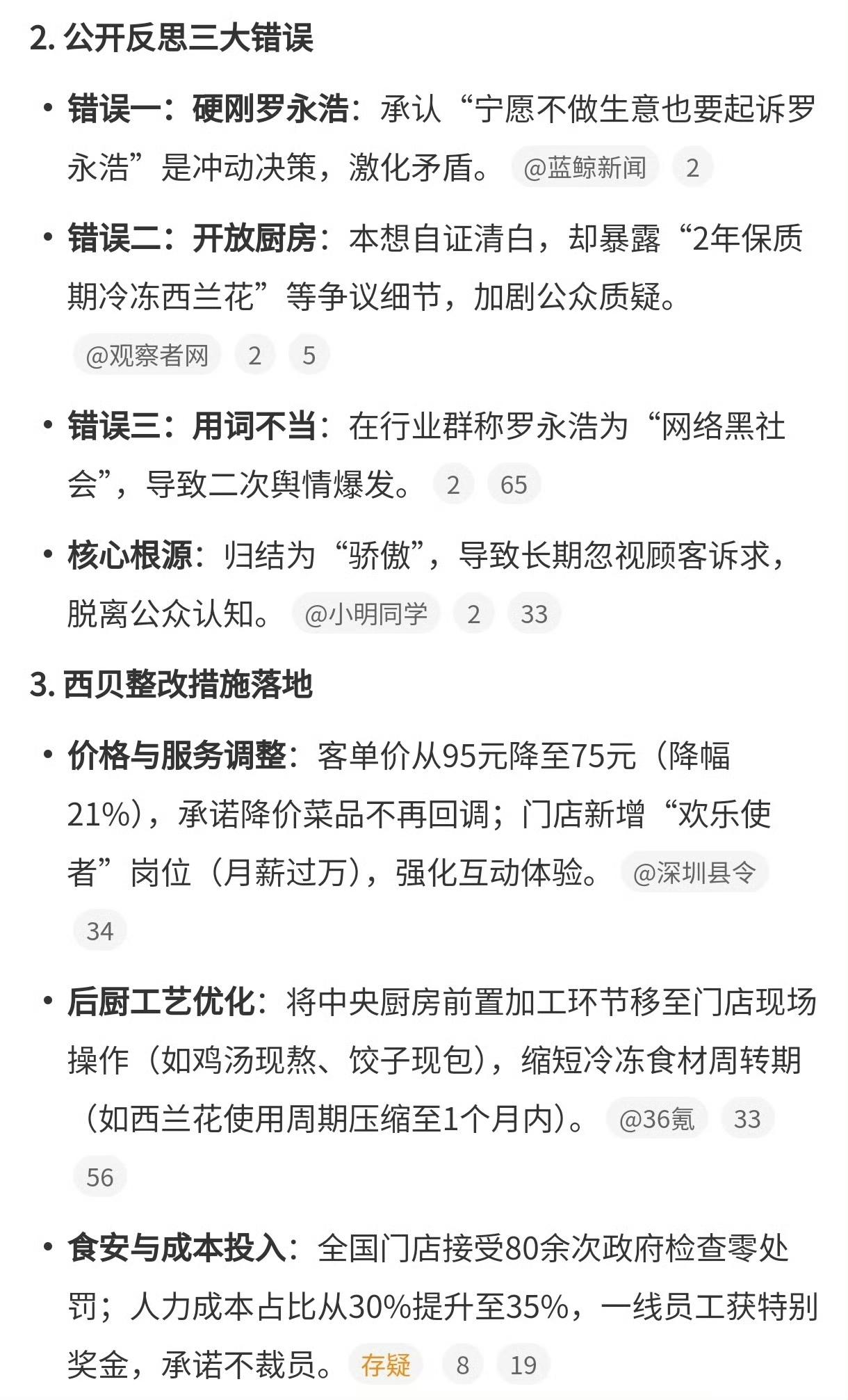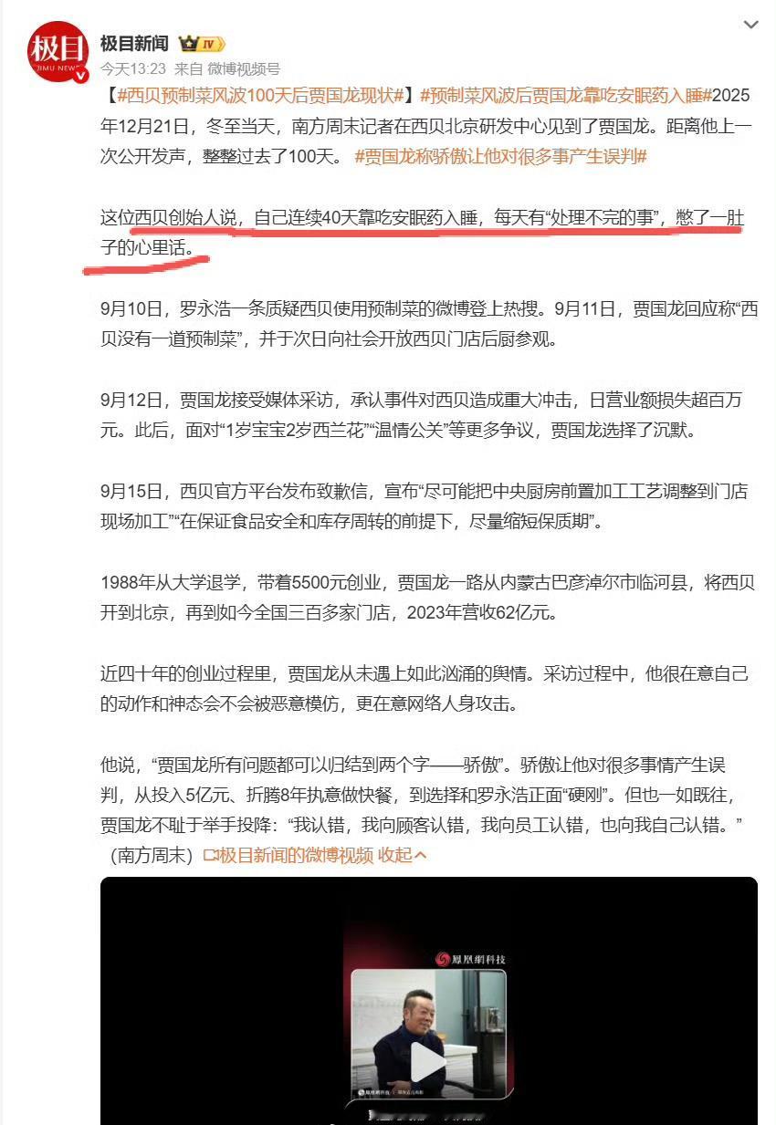 西贝风波100天!贾国龙靠安眠药入睡,认错后降价20%太圈粉 谁能想到,身家百亿的餐饮大佬贾国龙,会为了预制菜愁到吃安眠药?冬至这天,消失100天的他终于露面,一句话戳中无数打工人:“骄傲让我误判了,不该跟消费者硬刚!” 还记得3个月前那场轰动全网的“预制菜大战”吗?罗永浩吐槽西贝全是预制菜,贾国龙直接硬刚“没一道预制菜”,还开放后厨,结果反倒爆出24个月保质期的冷冻西兰花,争议越闹越大。这100天里,他坦言自己连续40天靠安眠药入睡,这场危机比疫情还棘手。 你看他这认错姿势诚恳吗?“按国家定义央厨不算预制菜,但消费者觉得非现做就是,我不该抬杠!” ,他还认为自己错在不该抬杠上😓,其实老百姓不是说你不能用预制菜,是你用了预制菜不承认,价格定的比现做还高,你要让老百姓消费的明明白白😓。现在嘴软了,10多道菜改门店现制,鸡汤现熬、饺子现包、羊肉串现穿;40多道菜降价近20%,客单价降到75元,还承诺绝不涨价。这不你也知道什么是现做吗! 就像新国标要求的,餐饮门店必须明着标,让咱们有得选就行。现在西贝又降价又现制,还主动听意见,这波补救你买账吗? 你在外卖里吃到过“伪装现炒”的预制菜吗?你觉得餐饮企业该强制标注预制菜吗?评论区聊聊你的经历吧! 预制菜新国标 西贝降价 餐饮老板的不容易 消费者知情权