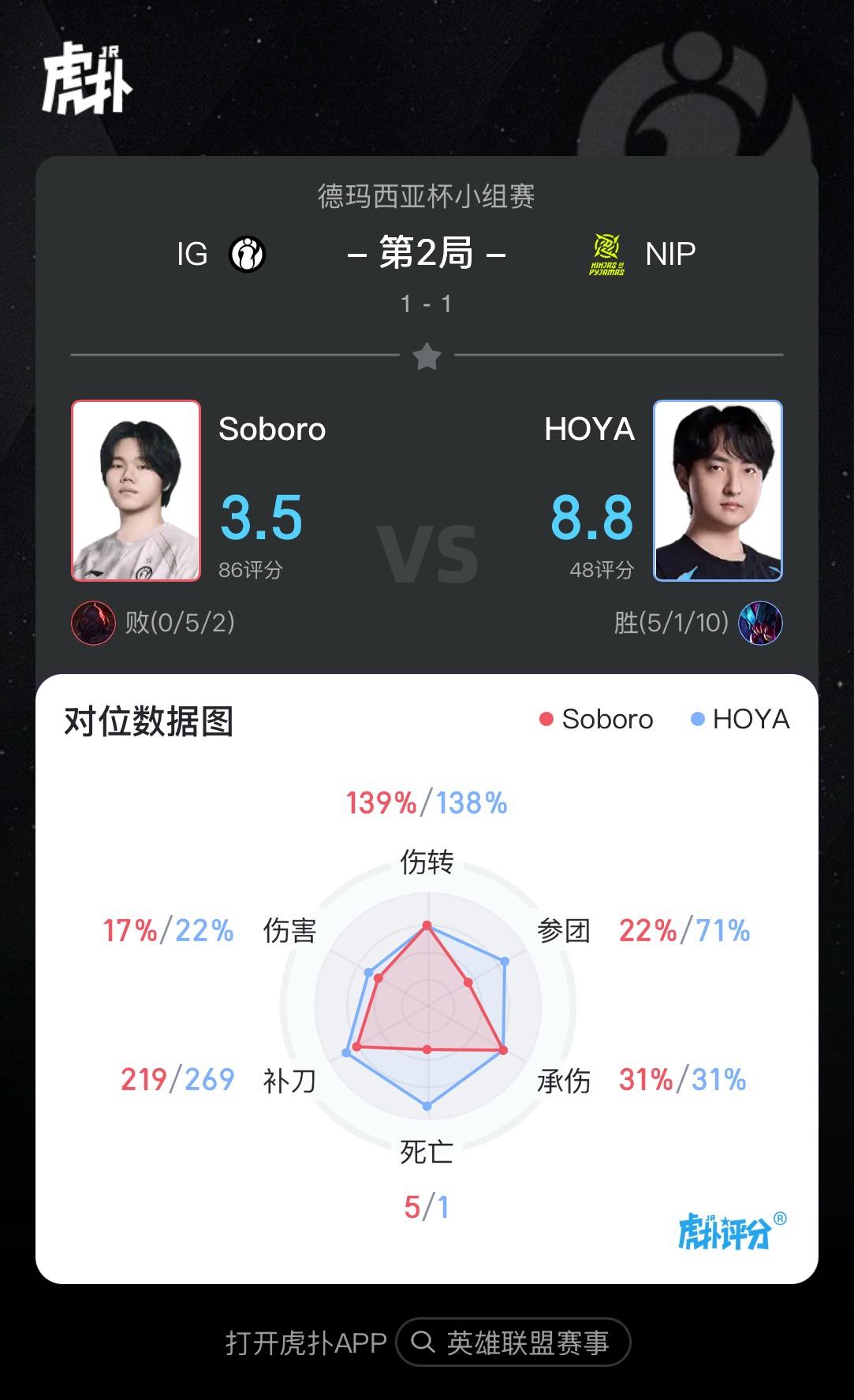 虎扑12月25日讯在刚刚结束的德杯小组赛NIP对阵IG的比赛中,HOYA挖掘机打出5/1/10战绩,拿下NIP对阵IG第二局MVP,这是他第2个MVP。