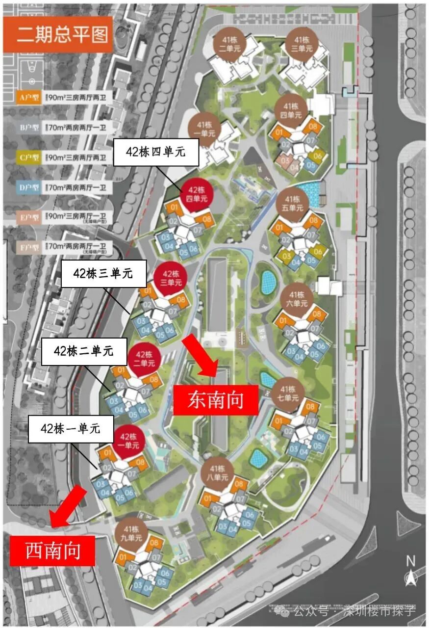全南朝向:本批次配售房源位于地块的东南侧,朝向上基本朝东南与西南向,保证每户的通风和采光面;视野开阔:房源位于社区内部,整体视野开阔无遮挡,近看中心园景,远看茅洲河景观。