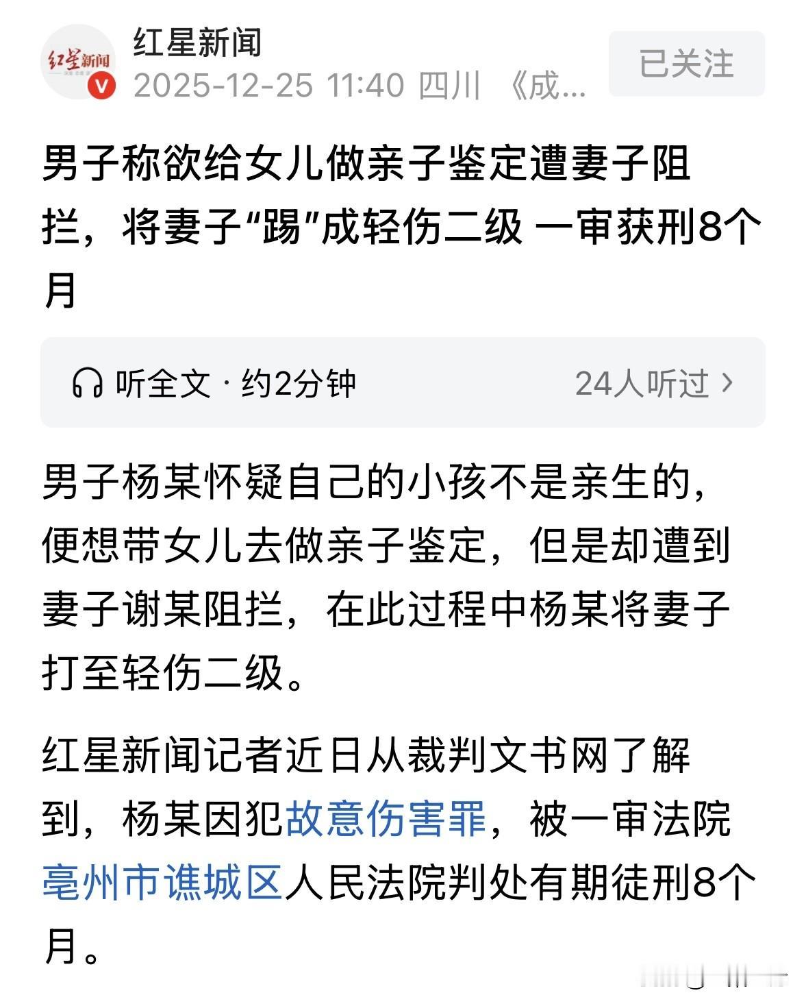 “这一脚代价太大!”安徽亳州,男子常年在外工作,逢年过节才回家和老婆孩子团聚,他一直怀疑,孩子不是他亲生的,就提出要去做亲子鉴定,谁料,妻子听后强烈反对,说啥也不让去,男子感觉猜疑得到了证实,和妻子大吵一架,激动之下给了妻子一脚,目睹全程的女儿吓得报了警。男子没想到,他这一脚导致妻子肋骨受伤,构成轻伤二级,这下性质变了,男子因故意伤害罪被追究刑事责任。结局让他欲哭无泪! 杨某工作繁忙,人经常在外地,和妻子孩子聚少离多。 今年,他好不容易趁着五一假期抽空赶回了亳州老家,可这人回来了,心却始终七上八下的。 因为杨某心里一直有一个疙瘩解不开。他非常怀疑,自己的孩子不是他亲生的。 这种感觉困扰他很久了,这次回家,他下定决心要把事情弄个明白。 假期里的一天,杨某把自己的怀疑和打算直接告诉了妻子谢某,并表示,他要带孩子去做亲子鉴定。 为了采样方便,他甚至直接动手剪了小孩的指甲盖和头发,准备拿这些当检测样本。 但谢某的反应出乎他的意料,也加剧了他的不安。妻子坚决不愿意去做这个鉴定! 谢某的强烈反对,就像往杨某本就燃烧的猜疑火上浇了一桶油。 他瞬间觉得自己的怀疑被证实了,不然妻子为什么这么抗拒? 杨某的理智彻底被冲垮,夫妻俩因为做鉴定的事,互相辱骂起来。 激烈的言语交锋中,积蓄已久的情绪彻底爆发了。杨某失去了控制,对着妻子谢某动了手。 在混乱的厮打过程中,杨某狠狠地一脚踹了出去,正好踹在谢某的肚子上。 这一脚的力道不小。剧烈的疼痛让谢某再也无法承受,她捂着肚子,踉跄着摔门而去。 女儿目睹了父母从争吵到动手的全过程,被这可怕的一幕吓坏了。 看着母亲痛苦地跑出去,惊恐之余,她想到了唯一能求助的方式,那就是报警。 接着,小姑娘果断拨打了报警电话。 谢某因为太过难受,她出了门就去了医院。诊断结果显示她肋骨受伤。 至于伤情有多严重,司法鉴定中心给出了专业的评判。谢某的损伤程度被评定为“轻伤二级”。 这说明,伤害达到了构成刑事犯罪的程度,这已经不是一场普通的夫妻纠纷。 事情闹到这个地步,杨某被卷入了刑事诉讼。在后来法院审理过程中,杨某坦白了自己的行为。 他承认自己确实因为怀疑孩子不是亲生的,想去做亲子鉴定,但遭到了妻子的强烈反对,这让他心里更加怀疑,最终导致两人从对骂发展到动手。 他明确供述,自己在殴打过程中,确实踢了谢某肚子一脚。他也承认,是女儿看到这一幕后报的警。 案子到了法院进行一审。法官们审理了所有的证据,包括杨某的供述、谢某的伤情鉴定报告、报警记录等。 根据《刑法》第234条第1款:故意伤害他人身体的,处三年以下有期徒刑、拘役或者管制。 法院认为,事情很清楚。杨某故意伤害了自己的妻子谢某,并且造成了谢某肋骨受伤、达到轻伤二级的后果。 这种行为已经触犯了法律,构成了“故意伤害罪”。检察院起诉的罪名是成立的。 那么,该判杨某什么刑呢?法院在决定刑期时,也考虑了杨某案发后的一些表现。 首先,杨某是在接到警方电话通知后,自己主动到案的,并没有逃跑。 到了公安,他也老老实实地把事情经过都说了出来,没有隐瞒。这属于自首。 对于自首的犯罪分子,法律规定是可以从轻处罚的。 在整个案件处理过程中,杨某主动表示认罪,也愿意接受法律的惩罚,并且签署了正式的“认罪认罚具结书”。 法院认为,这种态度也是可以给予从宽处理的。 综合考量了杨某的犯罪事实、造成的伤害后果,以及他具有自首、认罪认罚这些可以从轻或从宽的情节后,一审法院最终做出了判决。 杨某犯故意伤害罪,被判处有期徒刑8个月。这意味着他要在监狱里服刑8个月。 除了坐牢,杨某还必须为自己的行为给妻子谢某造成的伤害买单。 法院判决杨某赔偿谢某因为这次受伤而产生的各种经济损失,加起来总共1万2千多块钱。 一场由猜疑点燃的怒火,一次失控的暴力行为,一脚踹向伴侣身体的举动……最终的结果就是:丈夫失去了八个月的自由,要坐牢。妻子承受了身体的伤痛和心理的巨大创伤,孩子目睹了父母最不堪的冲突,心灵蒙上阴影。 一个原本完整的家,在瞬间支离破碎。 杨某的遭遇令人唏嘘。猜疑在他心里滋生后,他没有选择通过沟通、信任或者合法途径去求证,而是让愤怒吞噬了理智,诉诸暴力。 他怀疑孩子的血脉,却用最直接的方式伤害了孩子的母亲,也亲手葬送了自己和家人的平静生活。 8个月的刑期和1万多块钱的赔偿,只是法律层面的代价。可家破碎了,才是留下的最深重、最难以愈合的代价。 暴力,永远不是解决问题的方式,它只会带来更深的痛苦和无法挽回的伤害! 对于这件事,你怎么看? 欢迎关注@一案一论