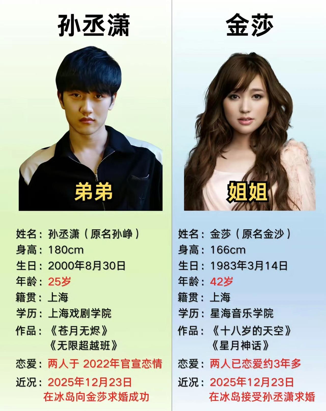 不管你们信不信,反正我信了!金莎孙丞潇是真爱啊!这对相差了17岁被全网嘲笑的"母子恋",如今在冰岛钻石沙滩迎来浪漫终章。当25岁的孙丞潇在极光下单膝跪地,为43岁的金莎戴上婚戒,这段相差19岁的恋情终于修成正果。 从全网群嘲到全民祝福,他们用三年时间证明:爱情从不是年龄的算术题。孙丞潇的坚持与金莎的坦然,让"狙击蝴蝶"的童话照进现实。极光下的求婚,不仅是爱情的胜利,更是对世俗偏见的温柔反击。 正如金莎所说:"爱情没有保质期,只有愿不愿意。"年龄不是问题,身高不是距离,说的就是他俩。