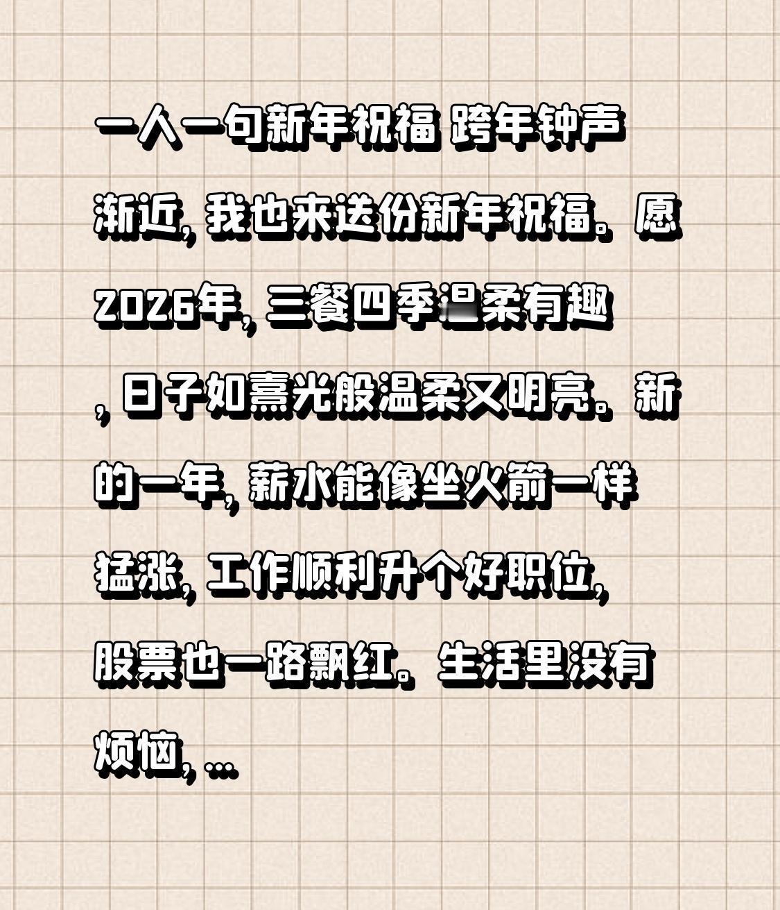 一人一句新年祝福 跨年钟声渐近,我也来送份新年祝福。愿2026年,三餐四季温柔有趣,日子如熹光般温柔又明亮。新的一年,薪水能像坐火箭一样猛涨,工作顺利升个好职位,股票也一路飘红。生活里没有烦恼,只有满满的幸福与欢笑。和旧岁潇洒挥别,与新年温暖相拥,未来的365天全糖去冰,日日都是好日子。愿大家在新的一年,有趣有盼,无灾无难,万事顺意!