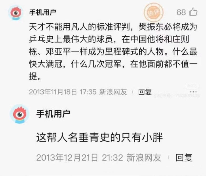 神奇!2013年就有人预言樊振东成就远超大满贯! 樊振东作为1997年生人,2013年他只有16岁。但是,这一年,就有人高度肯定他的未来,认为他将是乒坛历史上最伟大的运动员,名垂青史,连大满贯都不值一提。 2013年的网络平台还不像现在这么发达,发表这个看法的人连用户名都没有留下,只笼统显示“手机用户”, 不知道他(她)为什么这么早就如此肯定樊振东。 要知道,2013年,16岁的樊振东,虽然取得了一些成绩,比如第12届全运会团体冠军、单打亚军、波兰公开赛男单冠军、德国公开赛男单冠军,但都不是重量级的冠军。 国乒历史上,少年天才并不少见,比如方博,17岁横扫世青赛,一口气包揽男单、男双、混双和团体四块金牌,成就世青赛史上第一个四冠王霸业。 但是,这个人却在2013年就早早肯定了樊振东的未来。转眼时间来到了2025年,对照现实,神奇地发现,此人像个穿越者。 国乒历史上大满贯有好几个,比如马龙和张继科,都是荣誉加身。可能马龙的个人成就在大满贯里暂时是最高的,但马龙的强主要在乒乓球圈里,是传统金牌论里的王。 樊振东的不同之处,在于他的强不局限在乒乓球领域,就像他现在身处德国打球,真的不仅仅是在打球,又在波尔家里一起过节,他的视野已经超越了乒乓球。 樊振东为人有自己的底线和骨子里的硬气,他的生命质感、人格魅力、大时代下个人的内在觉醒与抉择,以及这些对大众精神层面产生的影响,都让他不同于以往的乒乓球大满贯得主。 樊振东2024年8月在《冠军来了》节目中表示,未来不一定是乒乓球了,但一定更好,对照当下的现实,这让2013年的预言显得更加神奇!