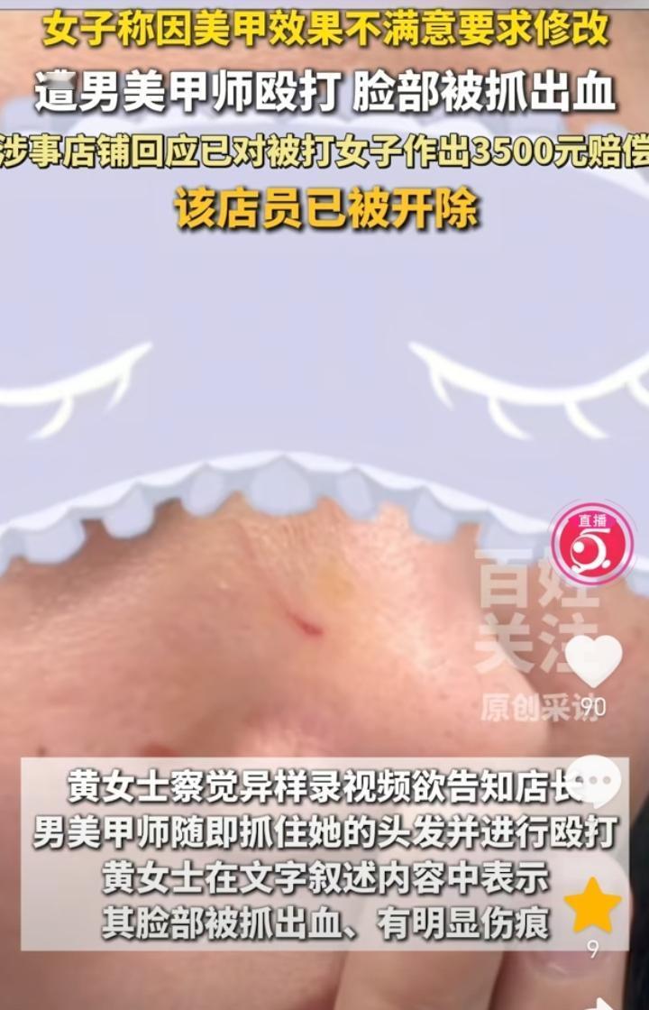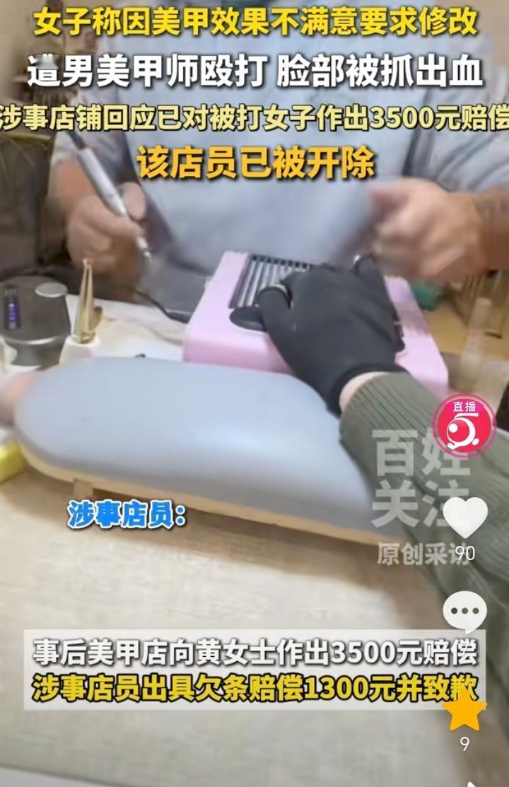 “顾客就是上帝”!江苏无锡,黄女士去美甲店做美甲,接待她的是一位男美甲师,美甲时黄女士先让男美甲师就甲型修补了三次,随后指出了指尖的色彩未涂均匀,男美甲师嫌黄女士太挑刺,没有经过黄女士同意就开始卸甲,黄女士察觉后准备录视频告知店长,男美甲师随即抓住黄女士头发就开始殴打,事后美甲店对黄女士做出3500元的赔偿,涉事店员出具欠条赔偿1300元并道歉,事后美甲工作室也是开除了涉事店员。 虽然黄女士确实有些难伺候,但是本着“顾客就是上帝”的原则,男美甲师也应该听从黄女士的要求,就算不听也要说服黄女士,而不是看着黄女士要告状就直接恼羞成怒动手打人,男美甲师这种性格根本就不适合做服务行业。 做事不要太冲动,动手打人是违法的,可能当时解气了,但是后果不仅要赔偿,而且还要被开除。