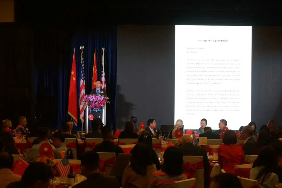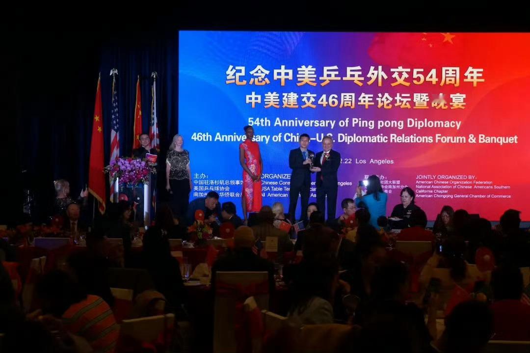 中美乒乓外交54周年郎平现身中美乒乓外交论坛 据消息,当地时间12月22日晚,纪念中美“乒乓外交”54周年论坛暨晚宴在洛杉矶工业市隆重举行。会议现场,美国奥委会国际关系部主任克罗斯兰向中国乒协颁发中美“乒乓外交”贡献奖。中国乒协获贡献奖 中国驻洛杉矶总领事郭少春大使及夫人王薇、国际乒联主席、国际奥委会委员佩特拉·索林、美国乒协首席执行官沈伟妮、中国驻洛杉矶副总领事郭志强、原中国排球队女排教练郎平、美国国家乒乓球队教练高军、美国南加州华人华侨联合总会会长蔡成华、美国奥委会国际关系部主任克罗斯兰、加州财务长马世云、加州众议员方树强以及曾参加1971年访华之旅的美国前乒乓球国家队队员戴尔及康妮·斯威里斯夫妇到场出席,美国联邦众议员赵美心发表视频致辞。