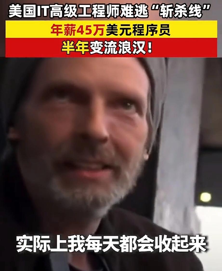 David chen在美国Mate担任高级工程师,有着不错的收入,年薪45万美元。在美国算是中产阶级。他的工资高,支出也高。每月需支付1万2房贷,3千车贷,还有1千5保险,以及一些其他的固定费用,拿到手里的钱所剩无几,还得省着点花。 今年的4月,chen被裁员。雪上加霜的是他又大病一场,治病又花费了一大笔钱。失去了资金来源,还不了贷款,半年后,被赶出住所,沦为街头流浪汉。 Chen背着帐篷,浪迹街头,靠乞讨为生。有时睡在别人的门口,有时唾在帐篷里。在帐篷里必须早点收起,以防止被人破坏,或被管理处移走。 chen这种生存状况被称为“斩杀线”,比喻美国底层群体生存临界状态。不仅仅指的是简单的“穷”,当财务跌至临界值的人,会被社会机制迫使流浪街头,生存时间不过几年,就被社会“斩杀”。美国官方数据显示,每年有2万多人因冻饿致死,还有1700多万人处于饥饿的状态中。 Chen这样的社会精英也跌入了斩杀线,暴露了美国在社会保障方面存在着问题。