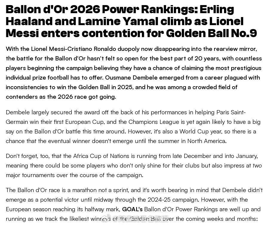 进球网最新金球排名:凯恩领跑,亚马尔第4,赖斯第5,梅西排名第9。其中对赖斯的评价如下:5--德克兰·赖斯(阿森纳)2025-26赛季: 3个进球,8次助攻。赖斯凭借上赛季欧冠对阵皇家马德里的出色表现,一举跻身世界顶级中场之列。此后,这位阿森纳球员的状态更是突飞猛进。在欧冠征程中取得完美开局后,赖斯已成为枪手最关键的球员之一,他们不仅力争英超冠军,更渴望队史首个欧冠冠军。赖斯的积极跑动、防守贡献和定位球传球意味着他很少错过比赛,同时他也是托马斯·图赫尔率领的英格兰队的首发球员,这支英格兰队看起来完全有能力结束60年的冠军荒,赢得2026年世界杯 英超联赛 阿森纳著名教授