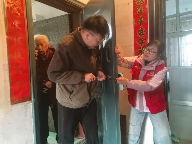 本报讯(记者韩睿文/摄)快递送到楼下,庞大娘要下楼去取,不料自家防盗门竟突然打不开了,老人急忙求助社区。网格员带维修工人及时开了锁,事后也致电老人子女提醒及时更换新锁,以防意外发生。
