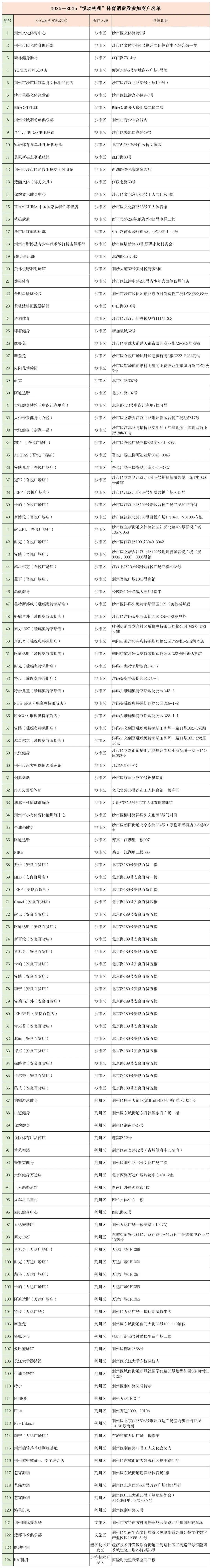 本次活动所发的消费券均在“云闪付”平台发放,用户需提前完成“云闪付”APP注册及绑定;适用于荆州市中心城区(包括荆州区、沙市区、经开区、纪南文旅区)内,合法登记、正常经营的各类体育相关场所,如:体育运动场馆、健身场馆、体育培训机构、体育用品专卖店、垂钓场等(具体适用商户名单附后),名单如有后续更新,以“云闪付”平台公示为准。