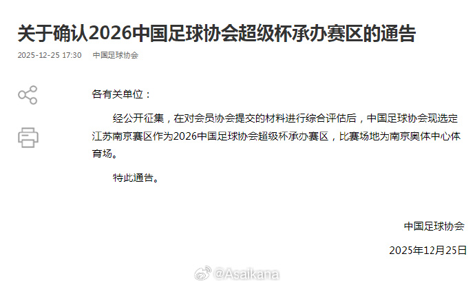 刚刚,足协确定了2026超级杯比赛地点。在通告中,足协表示经过综合评估,江苏南京赛区将成为2026超级杯的承办赛区,比赛场地为:南京奥体中心。 2025赛季,海港获得中超冠军,北京国安拿到足协杯冠军。超级杯就是这两大冠军对决的杯赛,这次,谁将上演2026赛季的开门红呢? 按照实力,海港夺冠概率更大,北京国安爆冷也不是没有可能。鹿死谁手,拭目以待!