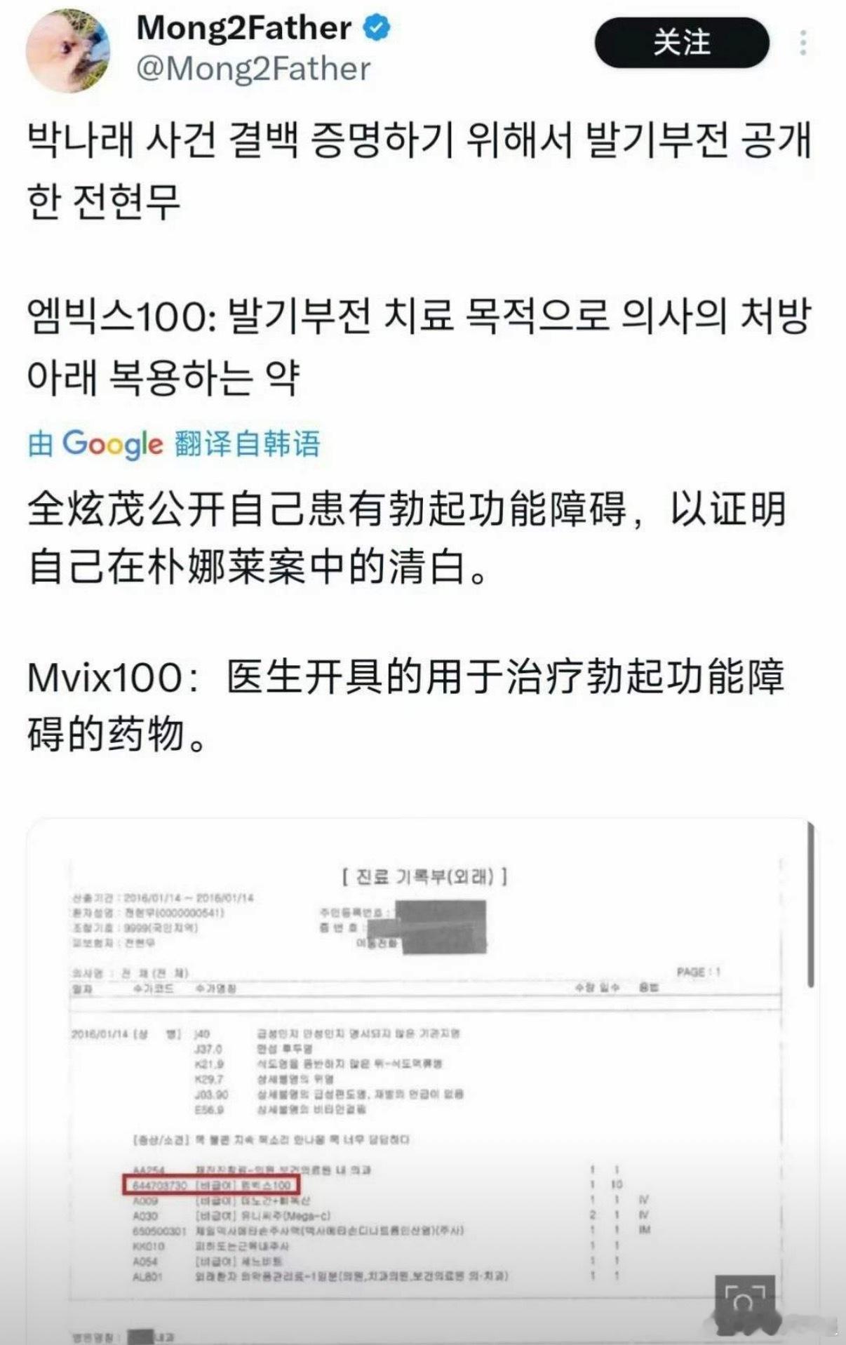 全炫茂吃治阳痿的药全炫茂公开病历自证未涉毒 全炫茂在尊严和没钱赚,选择放弃尊严!为了自证没有非法注射违禁药物,他公开了自己的病历,表示自己在车里注射的是治疗他无法勃起的药物。全炫茂这是真没招了,为了自证这都说了!可想想未来录节目时,这事儿大概率会被当成梗反复调侃!比起社死,被人嘲笑,从此丧失男人的尊严,他更害怕自己失去赚钱的机会,因为非法注射违禁药物的罪名一旦坐实了,他就没办法在娱乐圈赚钱了,和赚钱相比尊严不值一提。全炫茂 全炫茂吃治阳痿的药