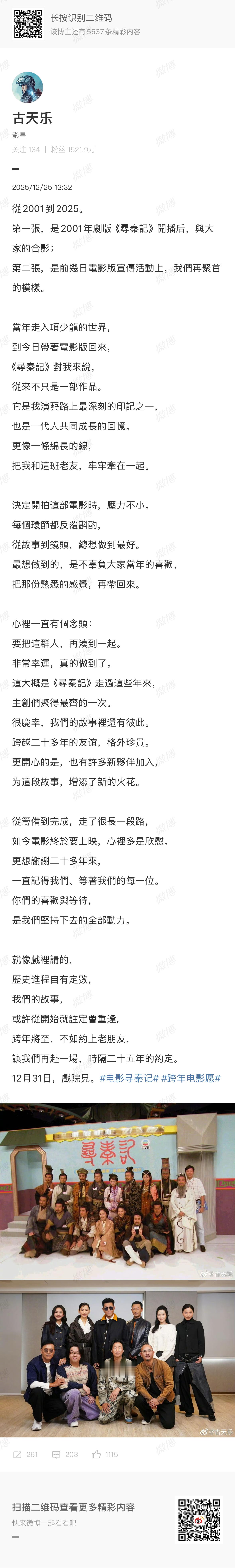 寻秦记主创跨越25年的合影古天乐发博分享两张跨越25年的合影,一张是2001年剧版《寻秦记》开播后主创们的合影;另一张是近日电影版宣传活动上,大家再聚首的模样。古天乐表示这是《寻秦记》走过的这些年来,主创们聚得最齐的一次,跨越二十多年的友谊,格外珍贵。“就像戏里讲的,历史进程自有定数,我们的故事,或许从开始就注定会重逢。”跨年电影愿