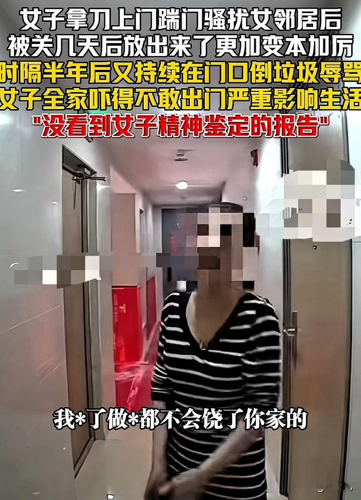 太过分了!半年前,邻居女子拿着刀上门踹门、辱骂、骚扰,把人吓得魂都没了。之后这名女子被带走关了几天,本以为事情到此为止。可谁能想到,时隔半年,这名女子再次出现,几乎天天守在门口,倒垃圾、骂脏话、恶意骚扰,行为一次比一次过分,这到底是怎么了? 被害女子一家人现在什么状态?门不敢出,灯不敢关,孩子一有动静就被吓哭。正常生活,彻底打乱了。 更让人无法接受的是,到现在,没有人看到这名女子的精神鉴定报告。 如果她精神有问题,那为什么能随意出来继续伤害别人?如果她精神没问题,那这种行为,为什么一而再、再而三被纵容? 邻里纠纷不可怕,可怕的是暴力、骚扰,被当成‘特殊情况’一次次放过。法律保护弱者,不是让正常人替失控者买单。 这件事,不是一句“她可能有问题”就能糊过去的。如果连家门口的安全都保障不了,那普通人还能躲到哪里? 你觉得,这种情况该怎么处理?评论区说说你的看法。 (新闻来源:中安新闻)
