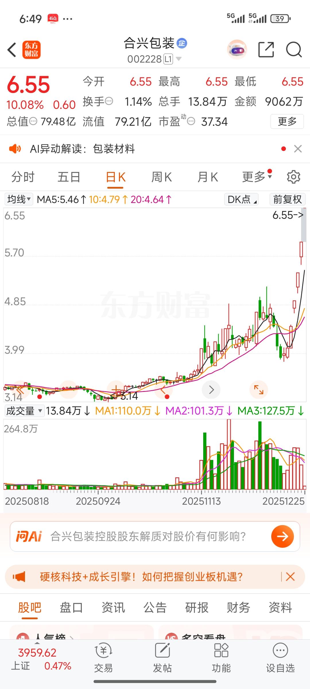 前几天一直关注的包装类三剑客。嘉美包装持续一字涨停,走势最为强劲。其次是合兴包装,今日缩量一字涨停,有加速上涨的态势,似有仿效嘉美包装之意。此外还有昇兴股份股份,今日高开低走,处于“老三”地位,主要是因其前期已大幅上涨。接下来主要关注合性包装和嘉美包装的表现。目前这两只股票中,嘉美包装更占优势,合兴包装是否能后来居上呢? 妖股 股票