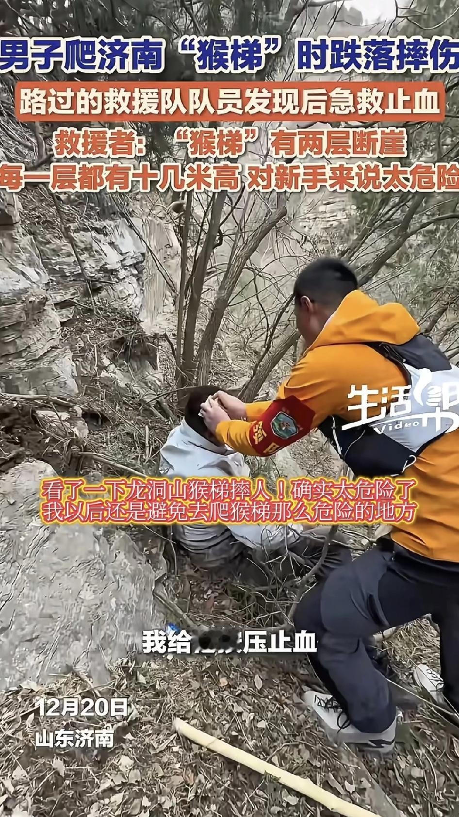 某户外博主救人救得火大,济南龙洞山猴梯连续三天摔人,又菜又爱玩的尽量不要冒险! 新救上来的这位男子穿着羽绒服就上山了,好在摔下去后神智还算清醒,脚下就是30米悬崖,也算是命大。 图一绿色是涧底环线,画红圈的就是猴梯,断崖那块看着就挺危险。 一切挑战以保障自身安全为前提,不是觉得自己行就行,脑子一热地后果没人能担得起。