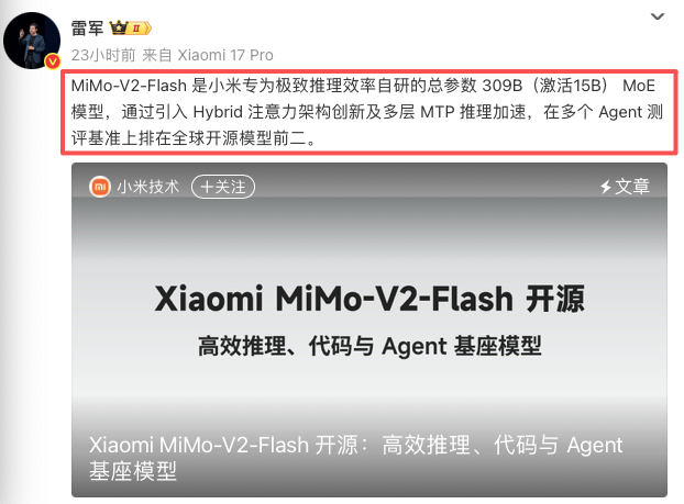 小米大模型也太牛了,雷军:小米最新MiMo大模型在多个Agent 测评基准上排在全球开源模型前二。