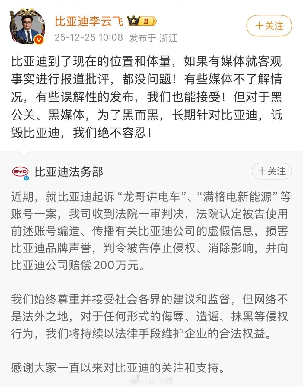 法院判决自媒体赔偿比亚迪200万元 比亚迪这波硬刚黑公关,干得漂亮!造谣一张嘴,辟谣跑断腿,这次直接法律武器安排上,给某些为黑而黑的自媒体敲了警钟。支持车企用法律守住底线,也该让网络环境清朗点了~大v聊车
