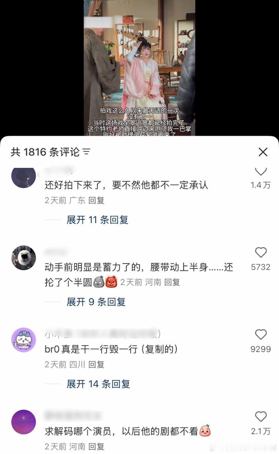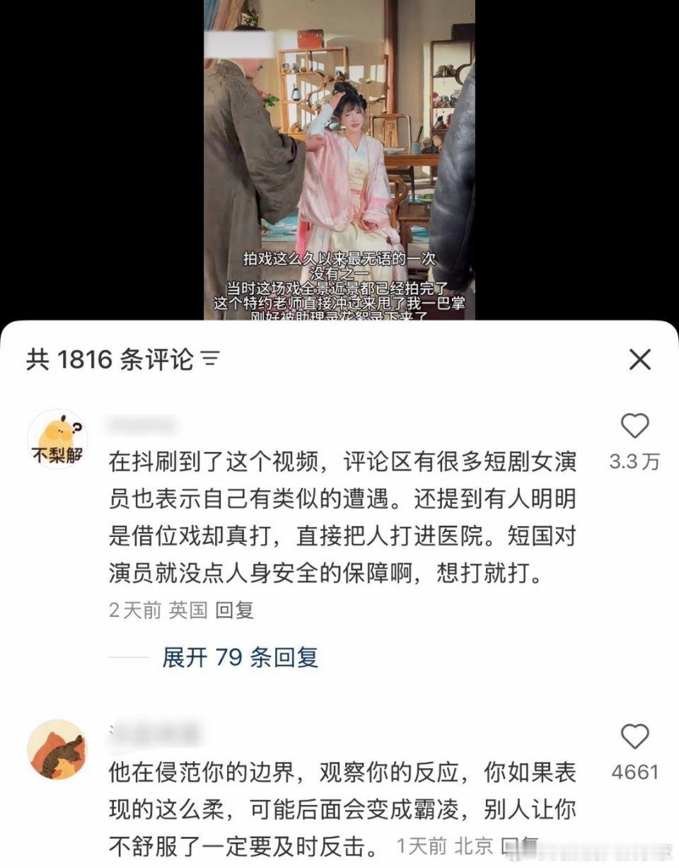 简直是太过分了!短剧女演员张乙萌在拍戏间隙突然被男演员甩巴掌,事后该男演员笑嘻嘻地称是在练位置练手劲。女演员就坐那休息是惹着他了?感觉就是故意的,蓄力动作非常明显,哪有私下假.打还要这么蓄力的,那一下挥得结结实实的,练手根本就不需要使这么大力啊!主要还是短剧,其实根本没人在意是不是真打,受伤戏都是直接抹一个红.颜.料,这个男的感觉是卯足了劲挥手,人品真的太差了。短剧女演员拍戏间隙被男演员甩巴掌