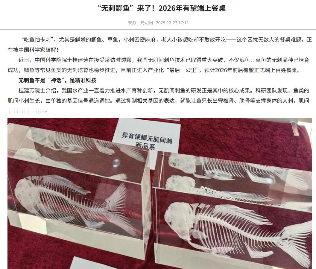 【无刺鲫鱼2026有望端上餐桌】中国人终于对鱼刺下手了让我们一起大声说:“谢谢科学家们!”最近,中国科学院院士桂建芳在接受采访时透露,我国无肌间刺鱼技术已取得重大突破,不仅鳊鱼、草鱼的无刺品种已培育成功,鲫鱼等常见鱼类的无刺培育也稳步推进,无刺鱼的口感和普通鱼完全一致,保留了鱼类的鲜嫩风味,只是解决了“卡刺”的痛点,目前正进入产业化“最后一公里”,预计2026年前后有望正式端上百姓餐桌。 (光明网)