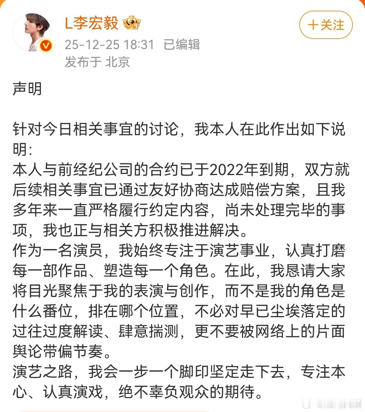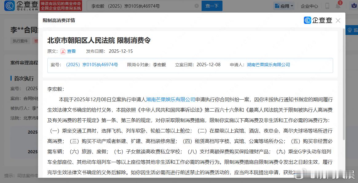 李宏毅回应被限高 25日,李宏毅 限高引发关注,法院向签发限制消费令,申请人为湖南芒果娱乐有限公司。该起案件案由为合同纠纷,李宏毅因此案被执行约1118万元。下午,回应称法院判决双方解除经纪合同,并且互相均应承担违约责任,李宏毅需要个人支付给湖南芒果娱乐有限公司1308万,李宏毅已经支付了部分款项,“限制高消费措施仅仅是因为李宏毅目前经济能力不足,没有能力立即履行全部判决款项。此事件不属于违法犯罪行为,也不属于违背公序良俗的行为,不会影响李宏毅与任何合作方的合作。”随后,李宏毅也发布声明,称多年来一直严格履行约定内容,尚未处理完毕的事项,也正与相关方积极推进解决。李宏毅限高涉案金额1118万