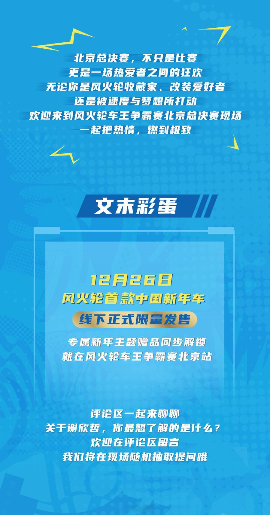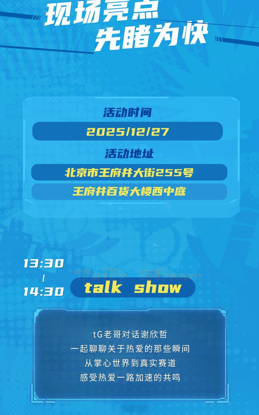 12月27日周六,风火轮车王争霸赛总决赛将在北京站举行!老哥会在现场与各位粉丝互动哦!赶快来参加吧!