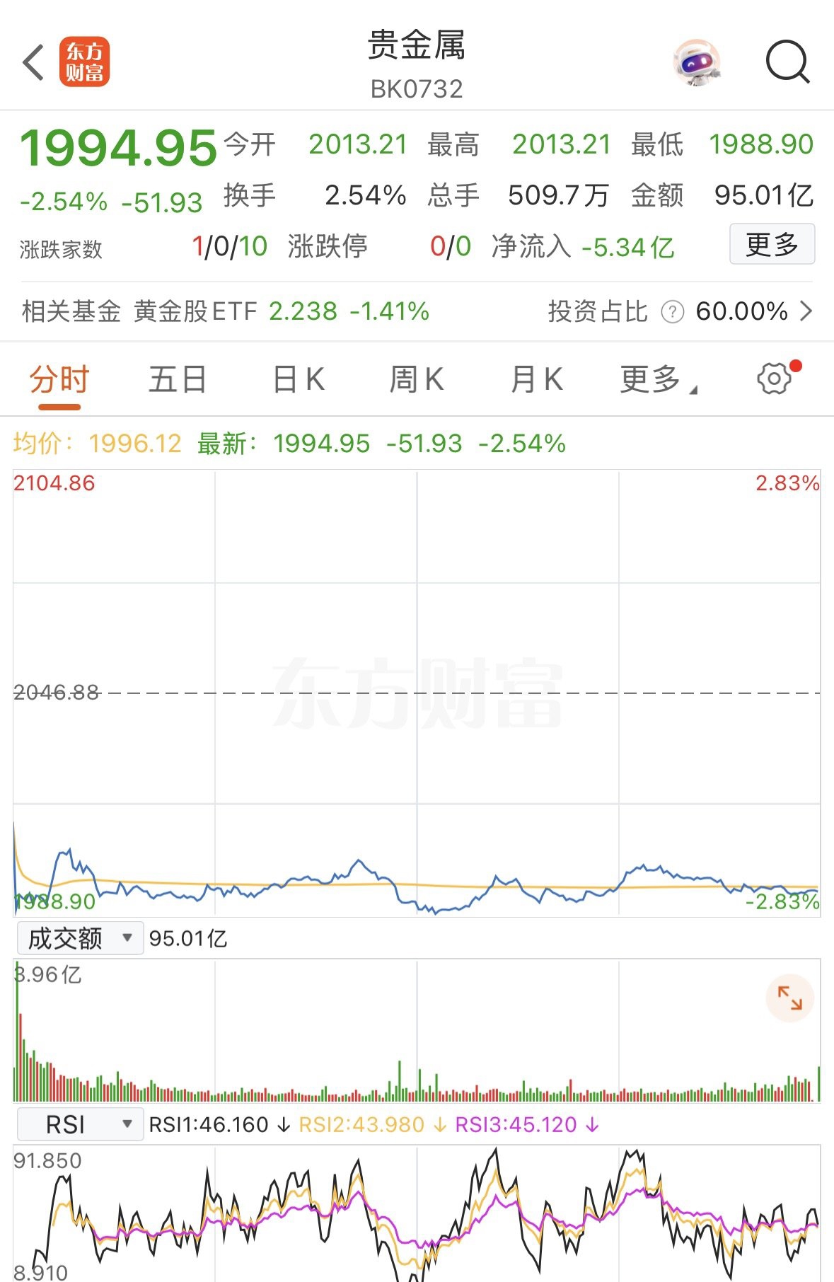 这边投资者在为板块上涨欢呼雀跃,那边“押注”贵金属的投资者却笑不出来了。原因无他——今日,贵金属板块低开低走,下跌2.54%。期货市场也不景气,国投瑞银白银期货(LOF)10:30复牌即闪崩,直接被摁在跌停板上。