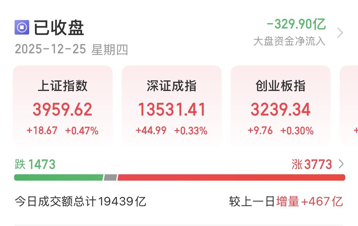 12月25日,A股三大指数集体小幅上扬,沪指日线七连阳。截至收盘,沪指涨0.47%,收报3959.62点;深证成指涨0.33%,收报13531.41点;创业板指涨0.30%,收报3239.34点。全市场全天成交额达到19439亿元,较昨日放量467亿元。上涨个股超3700只,涨停股93只。