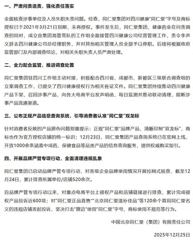 同仁堂集团高度重视全面核查整改工作,近期开展了一系列专项行动: