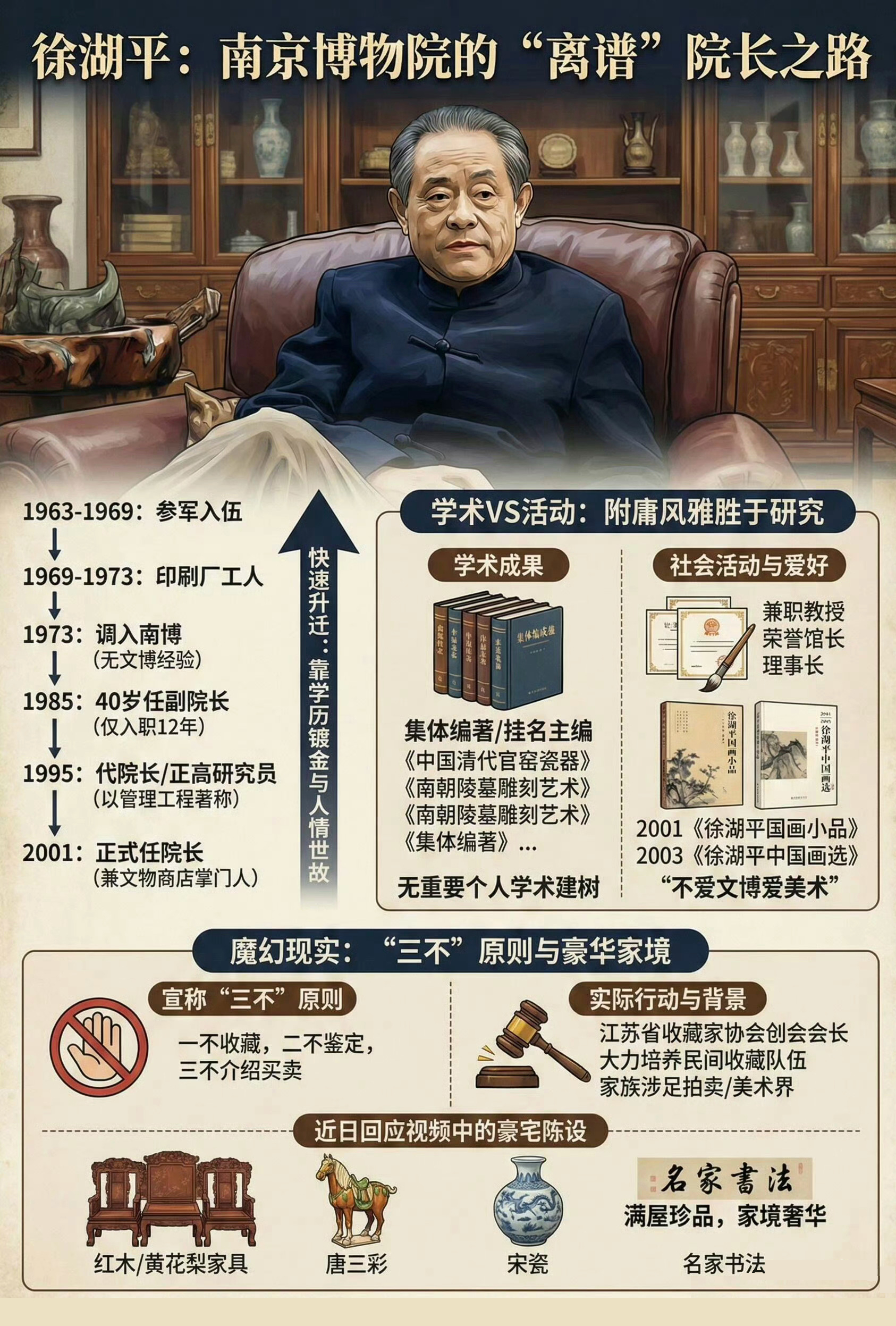 【徐湖平父亲在抗日战争应该是中级干部】因为徐湖平生于1945年1月,徐父徐志平和解放后正处级的徐母生下孩子,应该是经过严格的“二五八团”审批成婚的。“二五八团”是抗日战争、解放战争初期(1937~1948年),我军对八路军、新四军等干部结婚的三条硬标准简称,并非部队番号:即25岁以上年龄、8年以上军龄、团级以上职务,三者缺一不可,由组织批准方可结婚。徐父徐志明解放后就在南京,无论在军内外,以其资历和级别,应该能分到一栋民国时期国民党高官建造的宅邸。所以这该房屋和继承是无可争议的。关键问题在于徐湖平不思改造思想,腐化堕落和走向犯罪道路。官方通报南京博物院事件南京博物院徐湖平