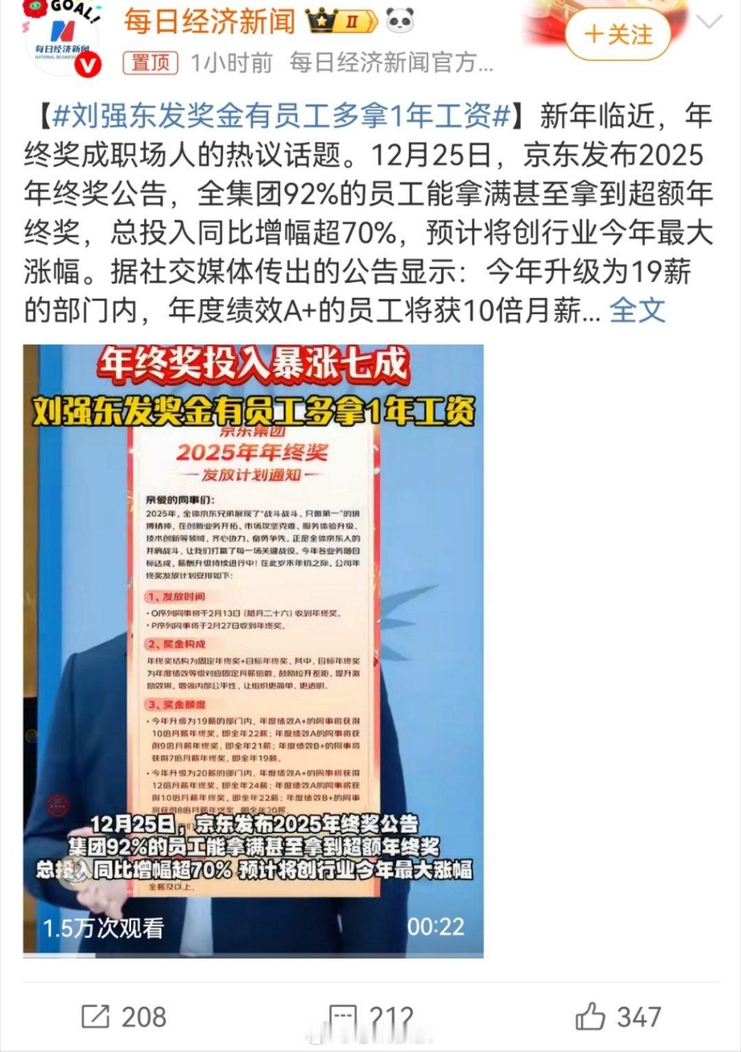 刘强东发奖金有员工多拿1年工资京东有的员工多拿1年工资。全集团92%的员工能拿满甚至拿到超额年终奖,总投入同比增幅超70%,预计将创行业今年最大涨幅。京东员工也太爽了吧!!而且今年升级为19薪的部门内,年度绩效A+的员工将获10倍月薪年终奖,即全年22薪;年度绩效A的员工将获9倍月薪年终奖,即全年21薪;年度绩效B+的员工将获7倍月薪年终奖,即全年19薪。而今年提前实现20薪的部门内,年度绩效B+的员工即可拿满8倍月薪年终奖,即全年20薪;年度绩效A+将直接获得12倍年终奖,全年24薪。采销岗今年将实现平均25薪,上不封顶。爽爆了好羡慕!京东还招人么 呼伦贝尔