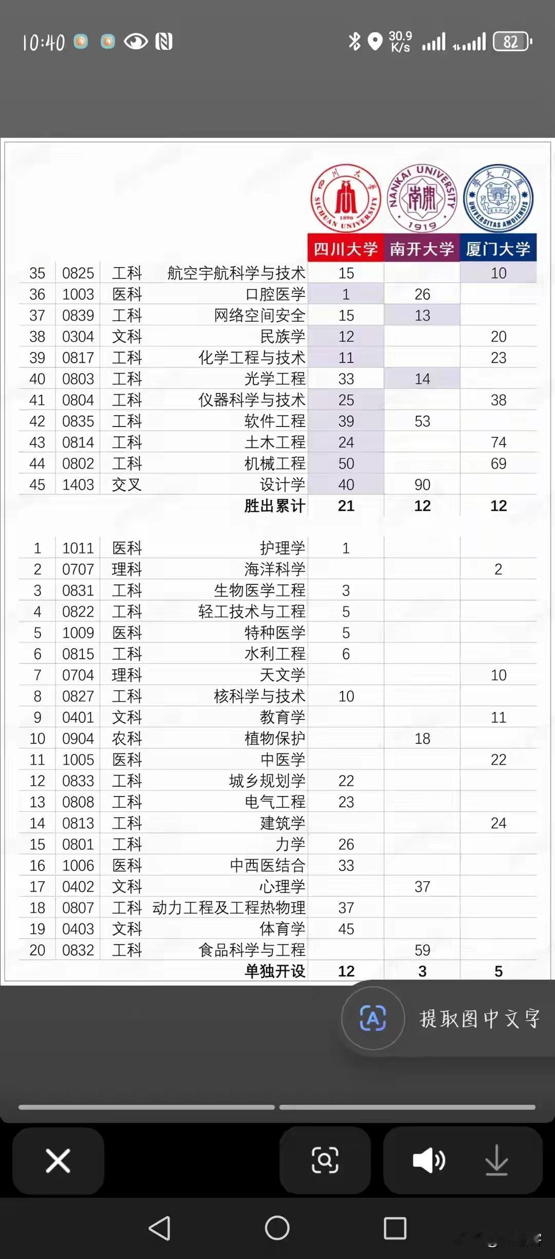 四川大学,南开大学,厦门大学,相同的专业全国排名,没想到四川大学碾压式完胜南开大学和厦门大学。 四川大学在考古学,哲学,公共管理学,数学,中国语言文学,法学,药学,材料科学与工程,临床医学,计算机科学与技术,基础医学,艺术学,管理科学与工程,口腔医学,民族学,化学工程与技术,仪器科学与技术,软件工程,土木工程 机械工程,设计学等多个专业上面完胜南开大学和厦门大学。 南开大学的优势专业在于化学,中国史,理论经济学,世界史,应用经济学,环境科学与工程,马克思主义理论,物理学,控制科学与工程,信息资源与管理,网络空间安全,光学工程。 厦门大学的优势专业在于工商管理学,政治学,生物学,社会学,外国语言文学,统计学,新闻传播学,生态学,电子科学与技术,信息与通信工程。 此外,四川大学还有多个单独开设的专业比如说护理学,生物医学工程,轻工技术与工程,特种医学,水利工程,核科学与技术,城乡规划学,电气工程,力学,中西医结合,动力工程及工程热物理,而且这些专业在国内也是全国一流高水平。