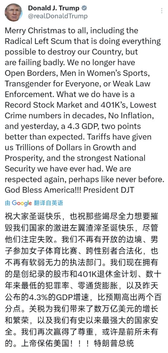 圣诞节当日,特朗普再次发文挑衅!12月25日,特朗普发文:“祝大家圣诞节快乐,也祝那些试图摧毁美国的激进左翼圣诞快乐,尽管他们注定失败。” 说白了,这就很符合特朗普的行事风格,这只不过是其趁着节日的风口,来拉拢保守派的基本盘,还不忘对左翼来了一波嘲讽。 要知道,这是特朗普的第二次上任,他的政治方法和拜登的截然不同,并且特朗普对拜登之的执政方式非常反感,甚至多次强调因为拜登开通绿卡,使得美国政府不得不多支出很多资金,还给国家带来了威胁(美国“枪击案”)。 说实话,特朗普就是喜欢吹牛,下面列举了一堆自己的成就(可见图片),其实不过是自欺欺人的把戏,这样的行为感觉不会得到更多的认可,反而会让更多人看到他的虚荣心。 说到底,特朗普的圣诞挑衅、成就自夸,其实是想用虚假政绩和个人表演来巩固基本盘,但这种自我吹嘘的套路,只会因数据造假让民意反噬,最终影响选举的结果。