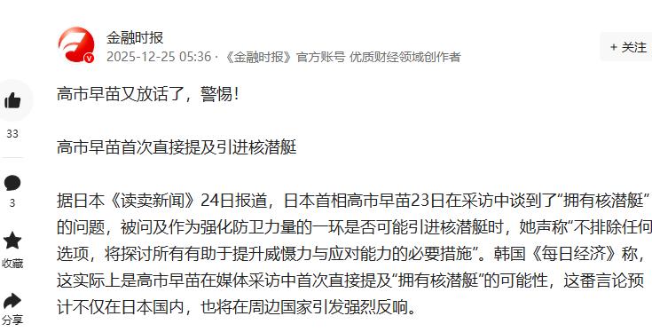 高市早苗又放话了,警惕! 高市早苗首次直接提及引进核潜艇 据日本《读卖新闻》24日报道,日本首相高市早苗23日在采访中谈到了“拥有核潜艇”的问题,被问及作为强化防卫力量的一环是否可能引进核潜艇时,她声称“不排除任何选项,将探讨所有有助于提升威慑力与应对能力的必要措施”。韩国《每日经济》称,这实际上是高市早苗在媒体采访中首次直接提及“拥有核潜艇”的可能性,这番言论预计不仅在日本国内,也将在周边国家引发强烈反响。 可能有人觉得这只是一句口头表态,但结合近期日本的一系列动作来看,这话可不能当耳旁风。 了解完这件事的来龙去脉,咱们得先说说高市早苗这个人,作为日本历史上首位女首相,她的政治立场一直很鲜明,是出了名的极右翼政客。 1961年出生的她,从1993年踏入政坛后,一路靠着保守派系的支持往上走,前首相安倍晋三对她也很赏识。她不仅多次参拜靖国神社,还否认日本的侵略历史,甚至把“九一八事变”后的侵略说成是“自卫战争”。 上台之后,高市早苗的强硬姿态就没收敛过,先是在台湾、独岛问题上发表挑衅言论,引发周边国家不满,现在又把主意打到了核潜艇上。 她一直主张修改日本和平宪法第九条,想把自卫队改成“国防军”,还不断推动增加防卫开支,提前两年就实现了防卫开支占GDP2%的目标,这背后扩军的野心昭然若揭。 说白了,高市早苗提引进核潜艇,本质上是在进一步突破日本战后的和平框架。 要知道,日本一直有“无核三原则”,而现在不仅是首相,连防卫大臣都在放风探讨核相关议题,这无疑是在挑战国际核不扩散体系。 更值得注意的是,这种言论已经在日本国内引发了反对声,前防卫大臣、在野党都站出来批评,认为这是不负责任的言论,会让日本陷入外交孤立。 对周边国家来说,这更是个危险的信号,日本作为二战战败国,本应深刻铭记历史教训,坚守和平道路,但现在却一步步推进“再军事化”,又是增加军费,又是放宽武器出口限制,再加上这次的核潜艇言论,只会加剧地区紧张局势。 中国、朝鲜等国已经明确表达了警惕和反对,毕竟谁也不想看到东北亚的安全环境被破坏。 更现实的是,大量的防卫开支最终还是要由日本民众承担,在通胀高企的背景下,民生领域的支出被挤压,医疗、社保预算可能被削减,这对普通民众来说并不是好事。 高市早苗政府一味追求军事扩张,忽视民生需求,这种做法显然不得人心。 目前来看,高市早苗只是表态“不排除选项”,但结合日本近期的一系列动作,后续动向不得不防。 毕竟,这种突破和平底线的试探,每一次都值得国际社会高度警惕。 以上都是个人观点,对此您有什么不同的看法,可以在评论区留言讨论!!!