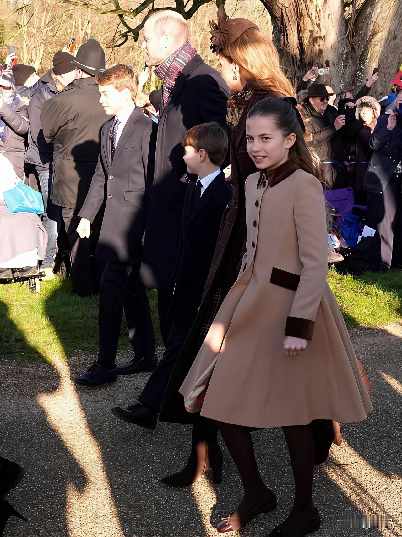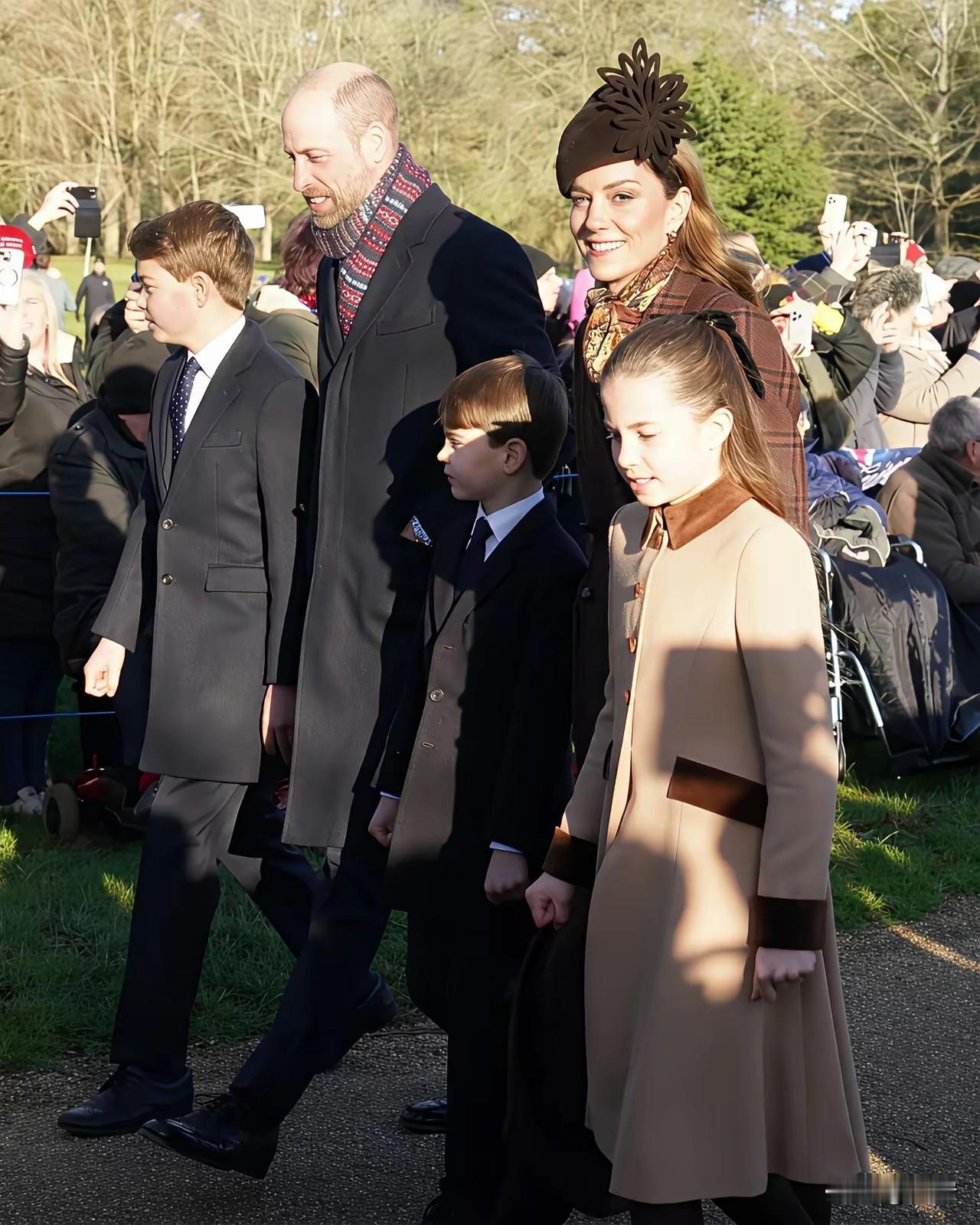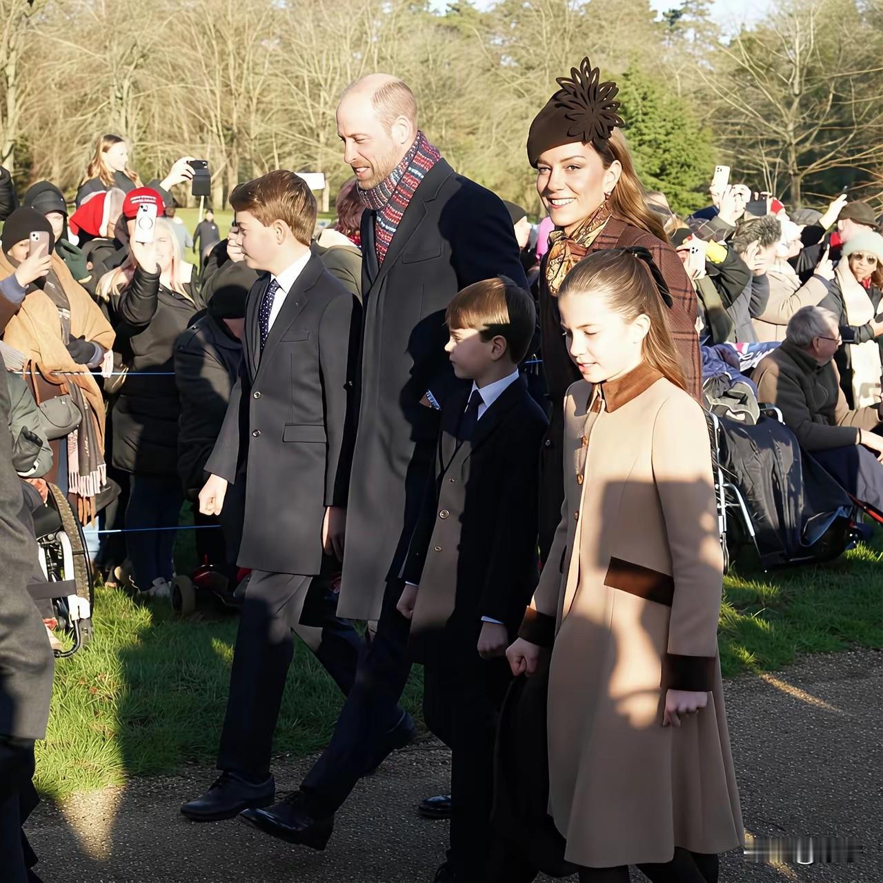 今天,威廉凯特带着三个孩子一起和全体王室成员一起亮相圣诞活动了! 12月25日,查尔斯国王和卡米拉王后带着全体王室成员一起在桑德灵厄姆圣玛丽教堂,出席圣诞早晨礼拜。 威廉王子与凯特王妃带着乔治王子、夏洛特公主和路易斯王子也来了! 凯特王妃一家子都整整齐齐穿上了大衣,威尔士三宝依旧是全场最吸睛的娃! 12岁的乔治沉稳,10岁夏洛特换新大衣甜美可人,7岁路易小王子乖巧得变成了小绅士。 凯特王妃和威廉王储望着自家的三个孩子,满眼都是疼爱!