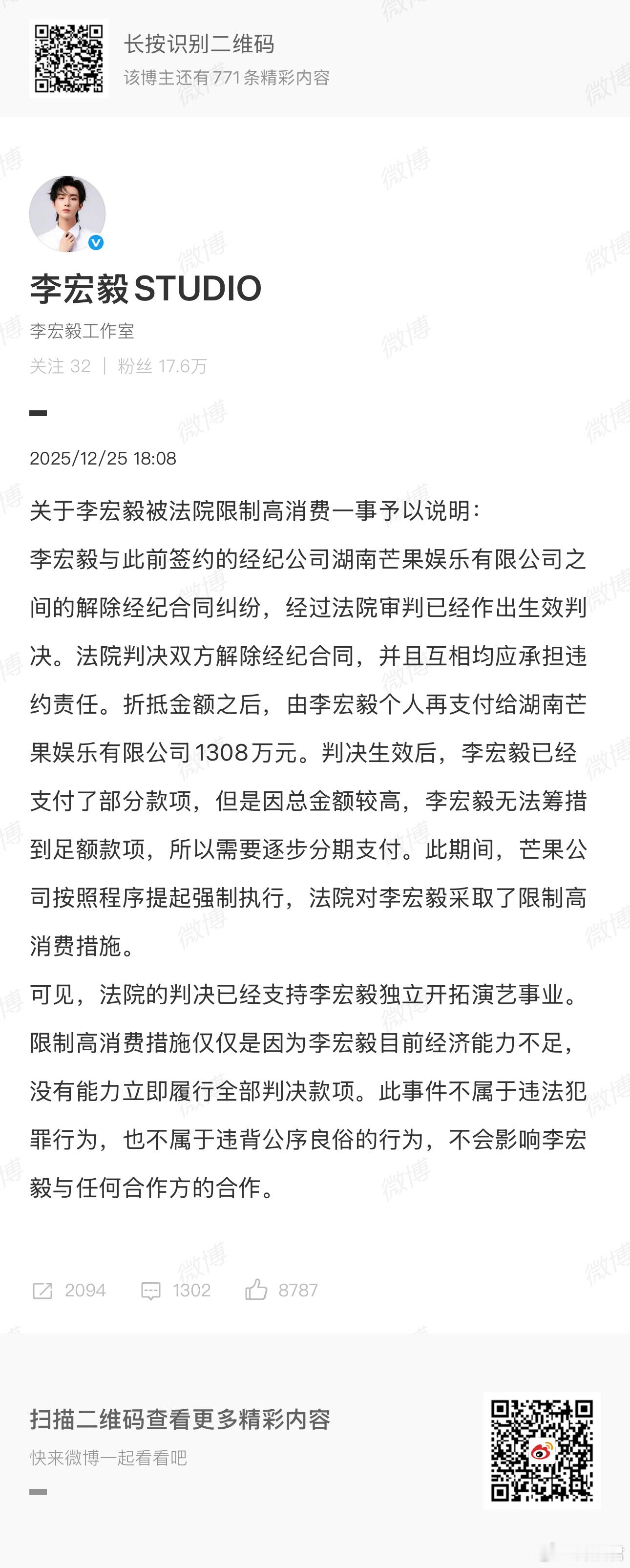 李宏毅说会专注本心认真演戏 李宏毅本人也发声明了,表示自己一直在对合同纠纷积极解决,会专注本心认真演戏,希望大家不要被带偏节奏。李宏毅本人声明李宏毅限高涉案金额1118万