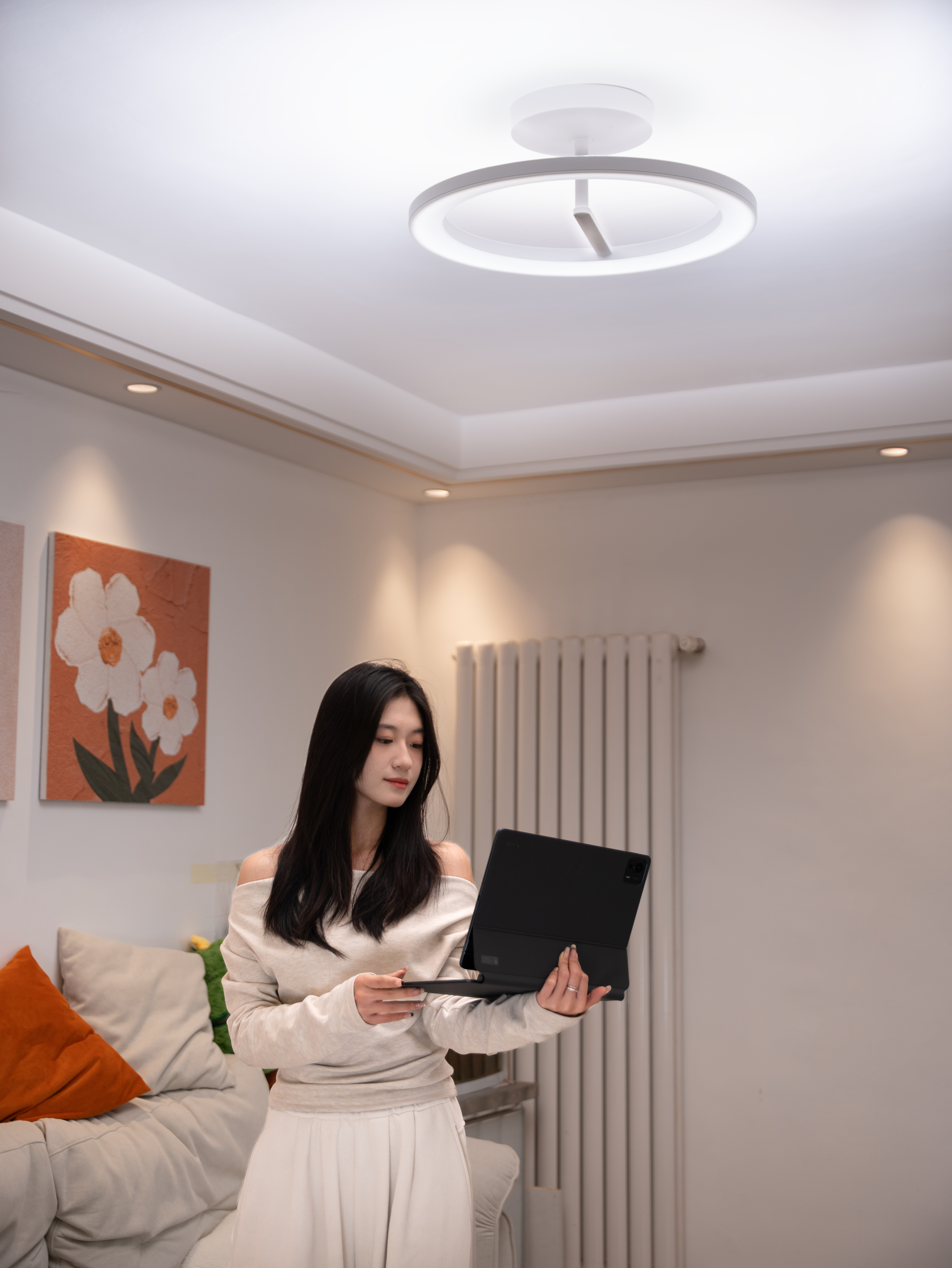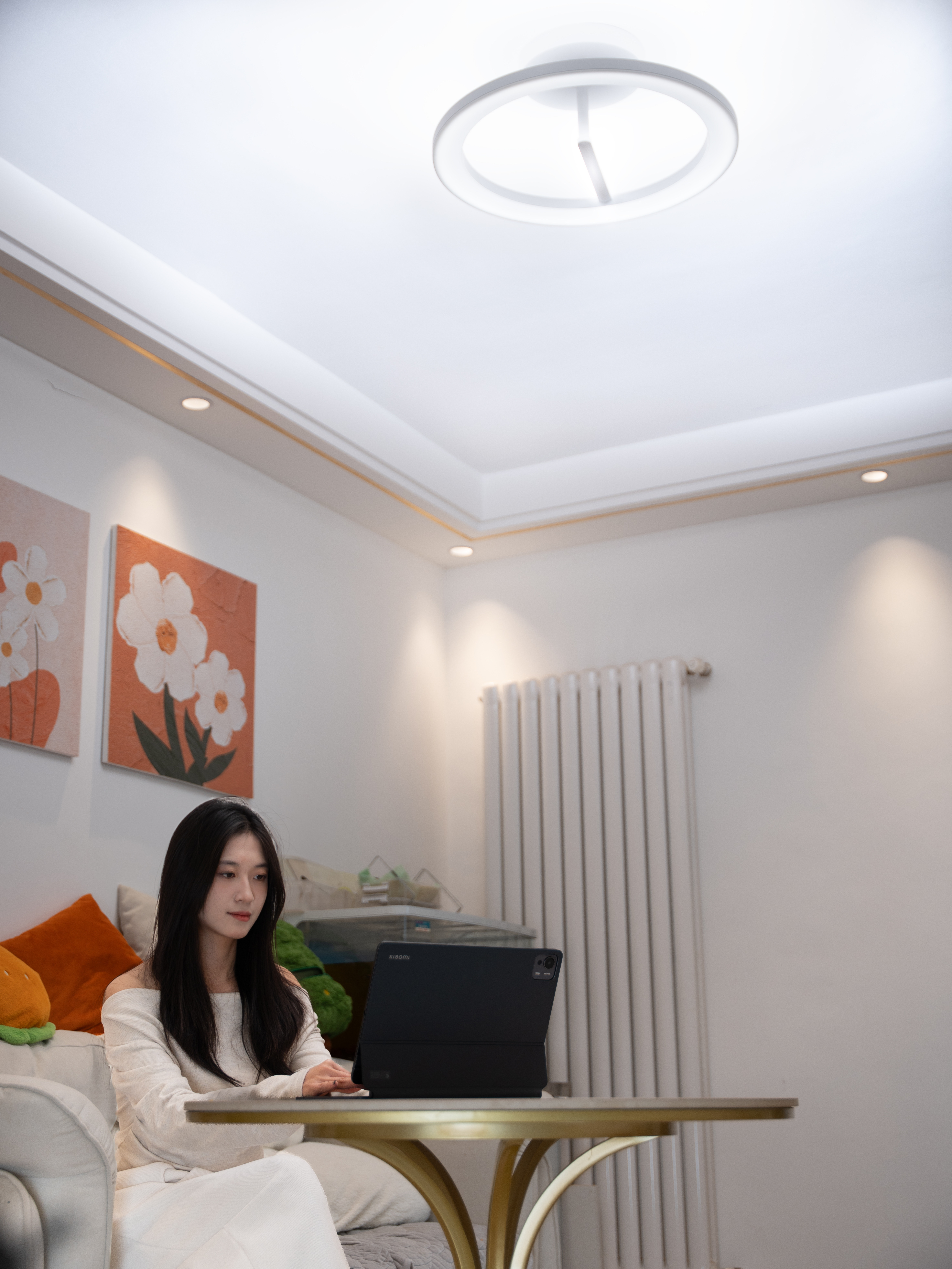 工作室装完这盏灯用了大半个月,才明白它为什么敢卖1899,果然贵有贵的道理。先聊咱们自媒体人大家最关心的三个痛点,也是我之前换灯的核心诉求:拍视频眩光反光、拍产品有阴影、房间照度不均显画质差。米家漫反射吸顶灯直接把这仨问题全拿捏了,上下双光源+550颗灯珠同步亮,上光源打到天花板,再通过漫反射铺满全屋,下光源精准补亮桌面、拍摄区这些核心位置。170°广角反射无死角,开灯瞬间整个工作室都透亮了,没有一点明暗分区,实测照度是国标的2.8倍,画质质感直接拉满。平时剪视频、写脚本盯屏幕几小时,光线柔和不刺眼,眼睛不酸不涩,加班赶稿都舒服不少。拍产品时没有阴影也不反光,不用额外补光灯也能出片。再说说护眼这块,平时天天跟屏幕灯光打交道,最怕蓝光伤眼,这盏灯是RG0级防蓝光,蓝光值拉到最低,长时间对着也不用担心伤眼。还有TÜV南德零眩感、母婴级、小米青山护眼三重认证。当我直视灯体,一点都不觉得晃眼,熬夜剪片、通宵赶稿眼睛都没负担。关键它的光是那种接近自然光的柔和,不会惨白刺眼的亮。拍视频画面不偏色,肤色也更通透,后期都省不少事。日常用着也很适配工作室节奏,语音控制调亮度色温,录视频需要冷暖光、剪片需要光线明暗,张张嘴就能调,不用起身打断思路。总结下来,这盏米家漫反射吸顶灯简直是自媒体工作室的灵魂。护眼抗疲劳,久坐盯屏不费眼,光线均匀无死角,拍视频拍产品不用额外布光,画质直接升级。同配置都卖3K多,它还不到2K,高端护眼一步到位,确实很值。科技家电新一代