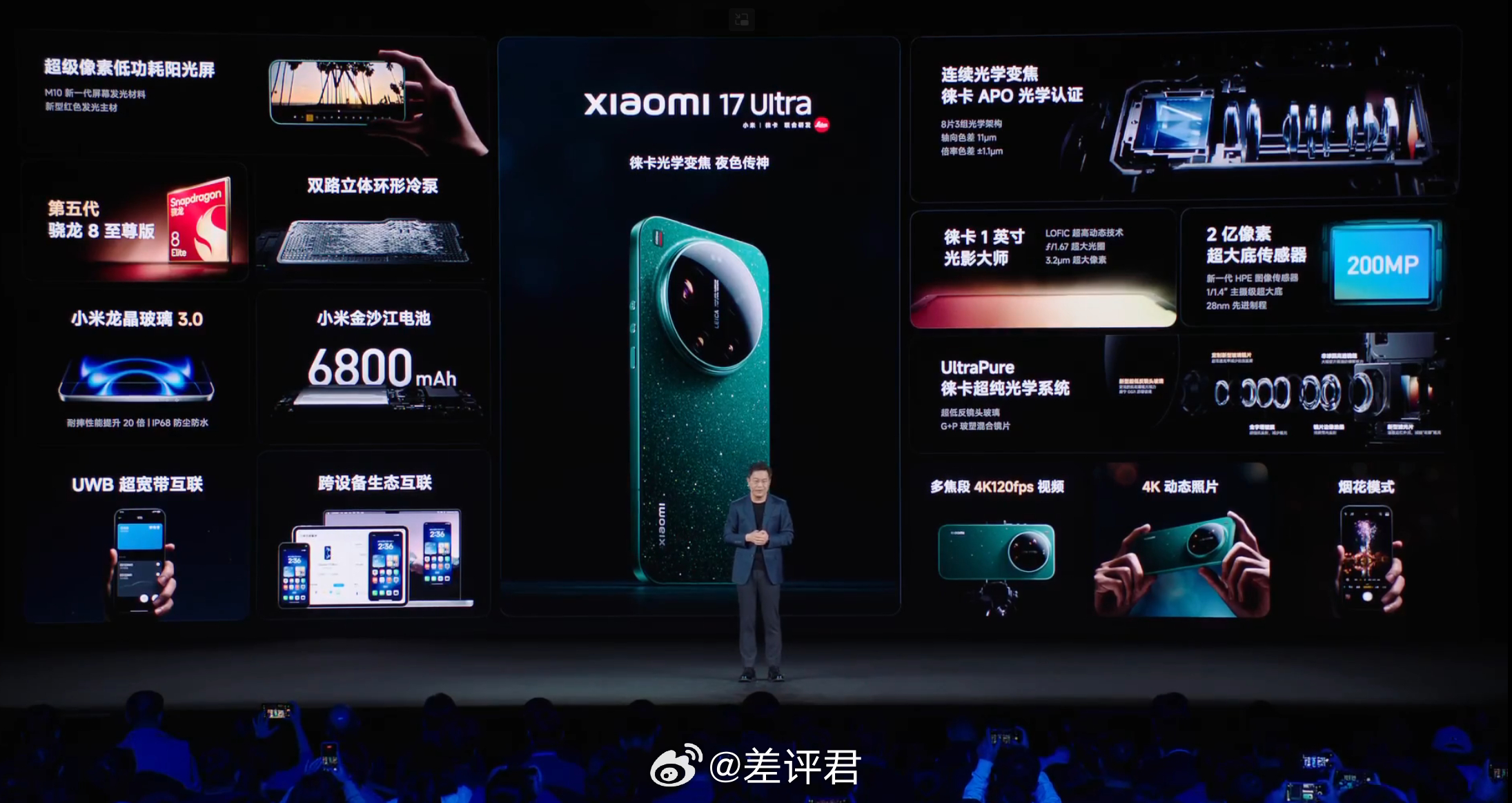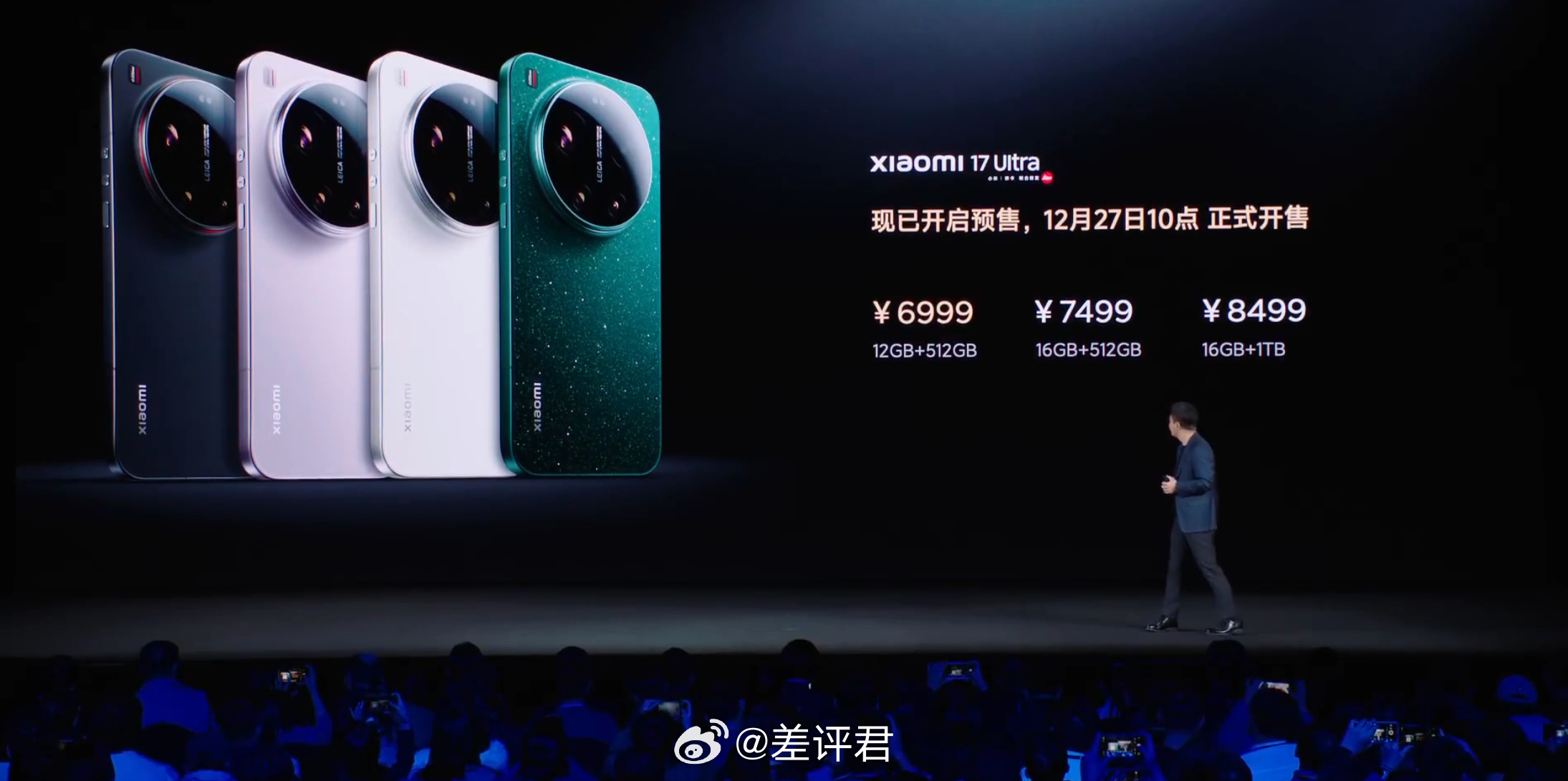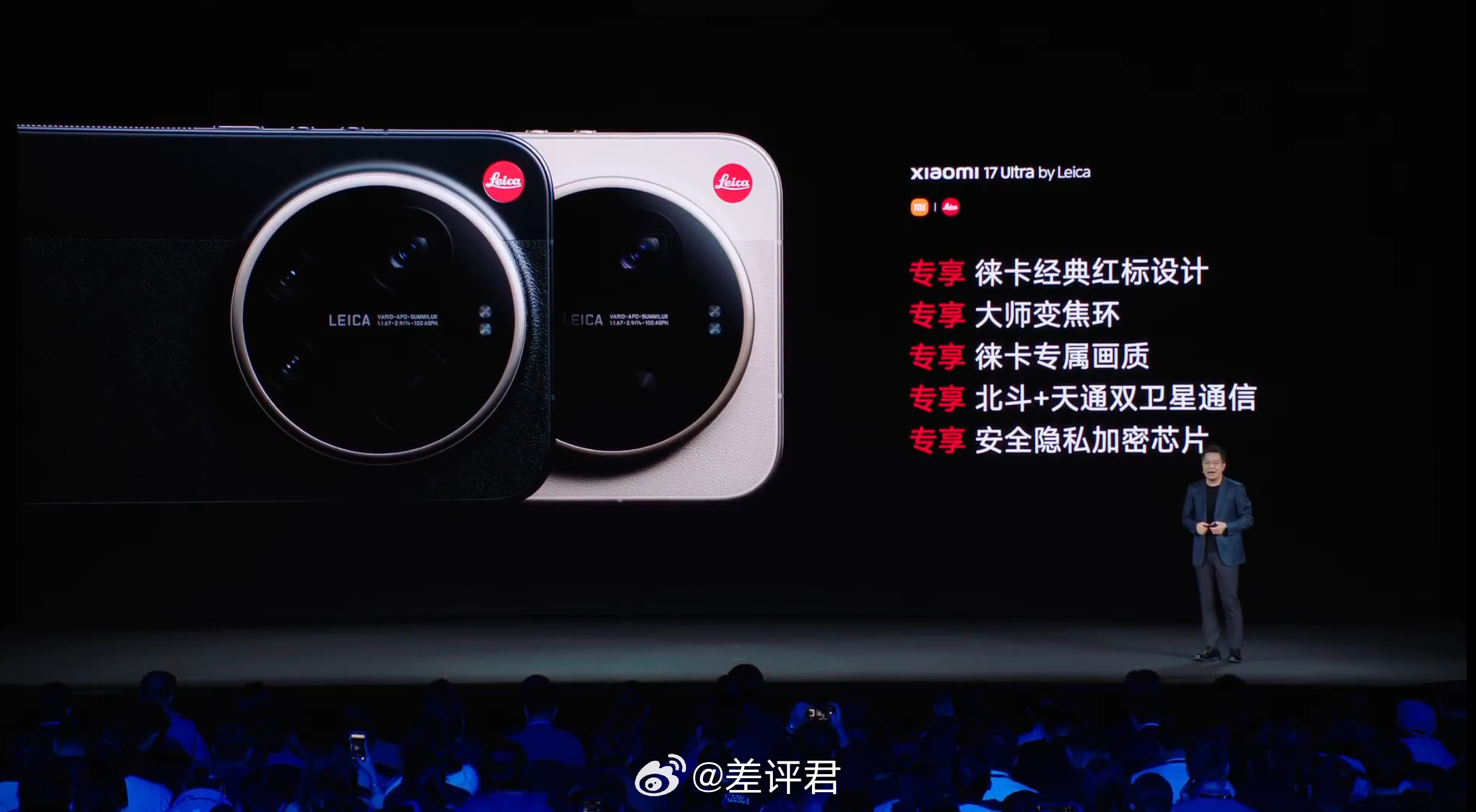 #差评说数码# 1 英寸大底主摄 + 2亿像素连续光变长焦的小米 17 Ultra 系列,两个版本的价格都有了:小米 17 Ultra,6999 起(12+512)小米 17 Ultra by Leica,7999 起(16+512)徕卡版是徕卡负责工业设计,有徕卡可乐标,另外多了变焦环、双卫星通信、隐私加密芯片以及徕卡镜头模拟这类软件上的特色,其他配置两个版本基本一致。我只能说当它开机是 Leica、相机图标标着 Leica、侧面刻着 Leica,背面还有 Leica 经典可乐标,甚至还内置了1:1 机型复刻的徕卡滤镜。。。这简直就是徕卡 17 Ultra #小米17Ultra# #小米发布会#