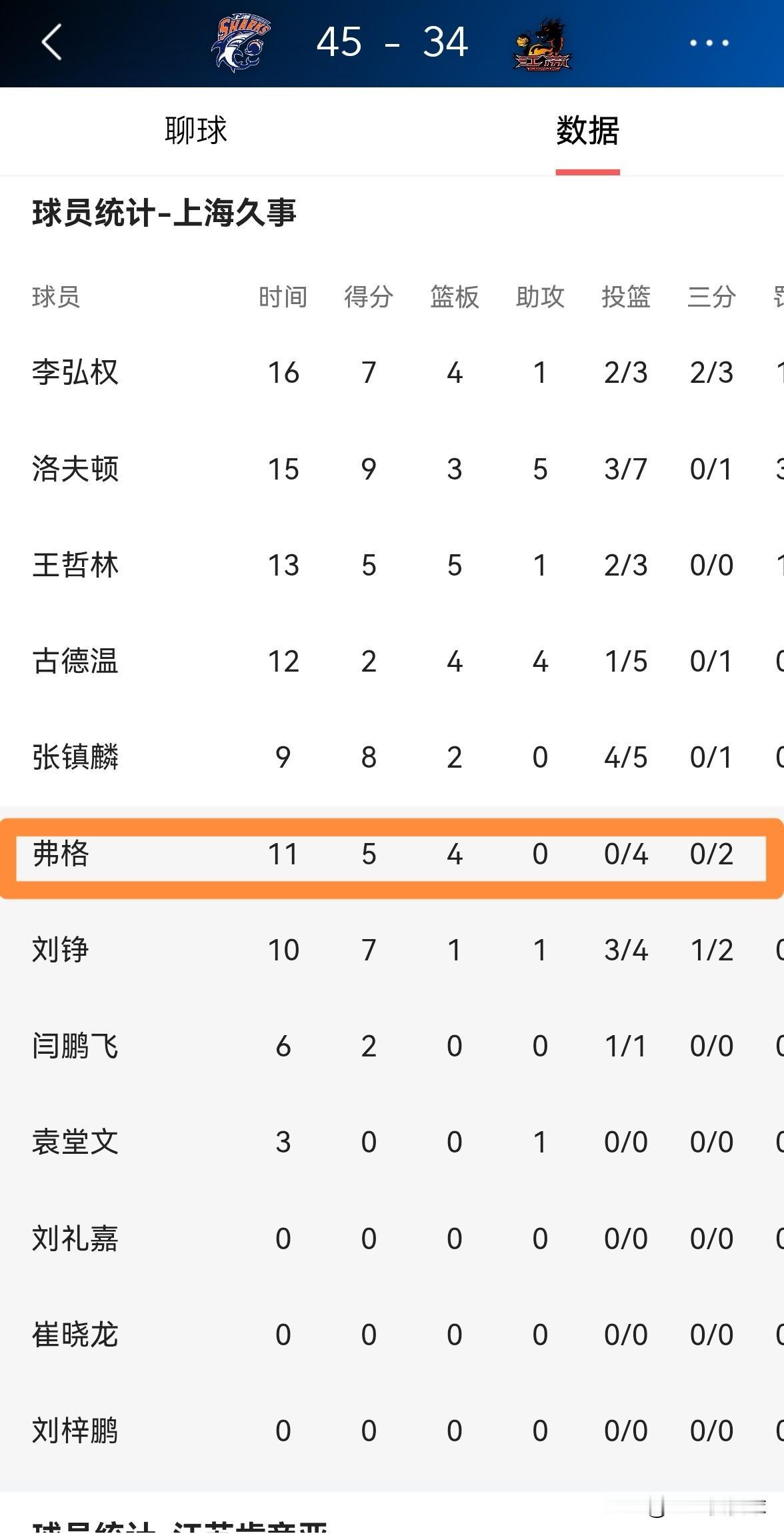上海久事老将弗格真是手感冰凉!在今天上海久事主场迎战江苏肯帝亚的上半场比赛中,弗格的投篮手感极其糟糕,他在替补出战的11分钟里,投篮4中0,其中三分球2中0、罚球6中5得到5分,还有1次失误和2次犯规。 作为上海久事的替补核心,弗格必须要在下半场比赛中找回自己的投篮手感才行,不然的话上海久事有可能会爆冷不敌江苏肯帝亚。