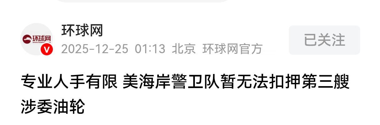 果然是愣的怕横的!美国想扣押第3艘油轮时遭遇反抗,无奈宣布暂停扣押 24号美国海岸警卫队突然发布了一则消息,声称无法对一艘与委内瑞拉有关的拒绝接受登船检查的油轮实施扣押活动了。 事情的经过是这样的,21号当天,一艘悬挂着巴拿马国旗的名为贝拉1号的船只被美国海岸警卫队盯上了,美国人要求对方停船接受检查。但万万没有想到,对方不仅不听,反而撒腿就跑,在跑的过程中,连续对外发出了至少75条求救信号。美国海岸警卫队一开始还想紧紧的盯着这艘船,然后派人使用直升机索降的方式控制对方。 但后续发现这根本就不现实,因为美国海警具有这种索降控制船只能力的安全反应小组只有两队,事发的时候,这种特殊小队距离过远如果把人员和设备调过来的话,需要消耗巨大的时间和资金成本,得不偿失。 在万般无奈之下,美国海警只好尴尬地宣布自己对这艘船实在是没办法了。果然是应了我们那句俗话,横的怕愣的愣的怕不要命。而由于美国海警的这种做法既不合理又不合法,所以从这个角度上来说,贝拉1号实际上完成了一次非常英勇的壮举,那就是当着全世界的面,让大家看清了美国的海岸警卫队实际上是一只纸老虎。只要敢于反抗,并且勇于作出实际动作,对方大概率会主动认怂。