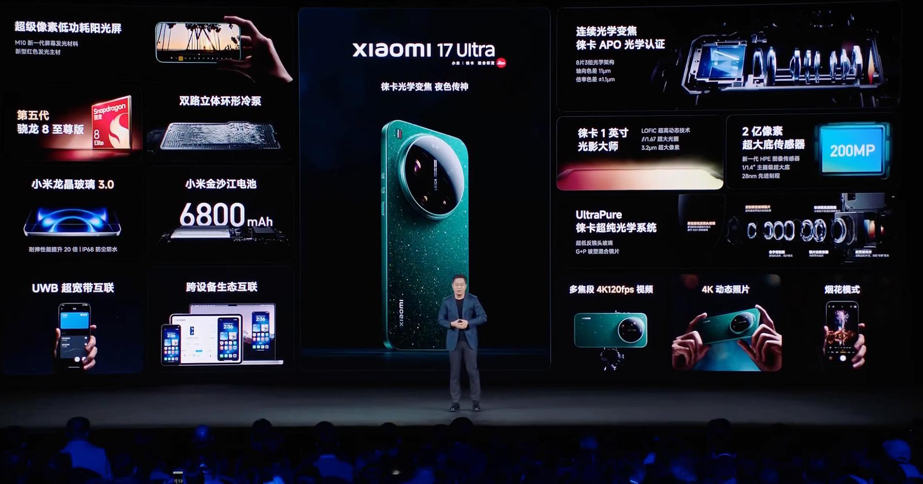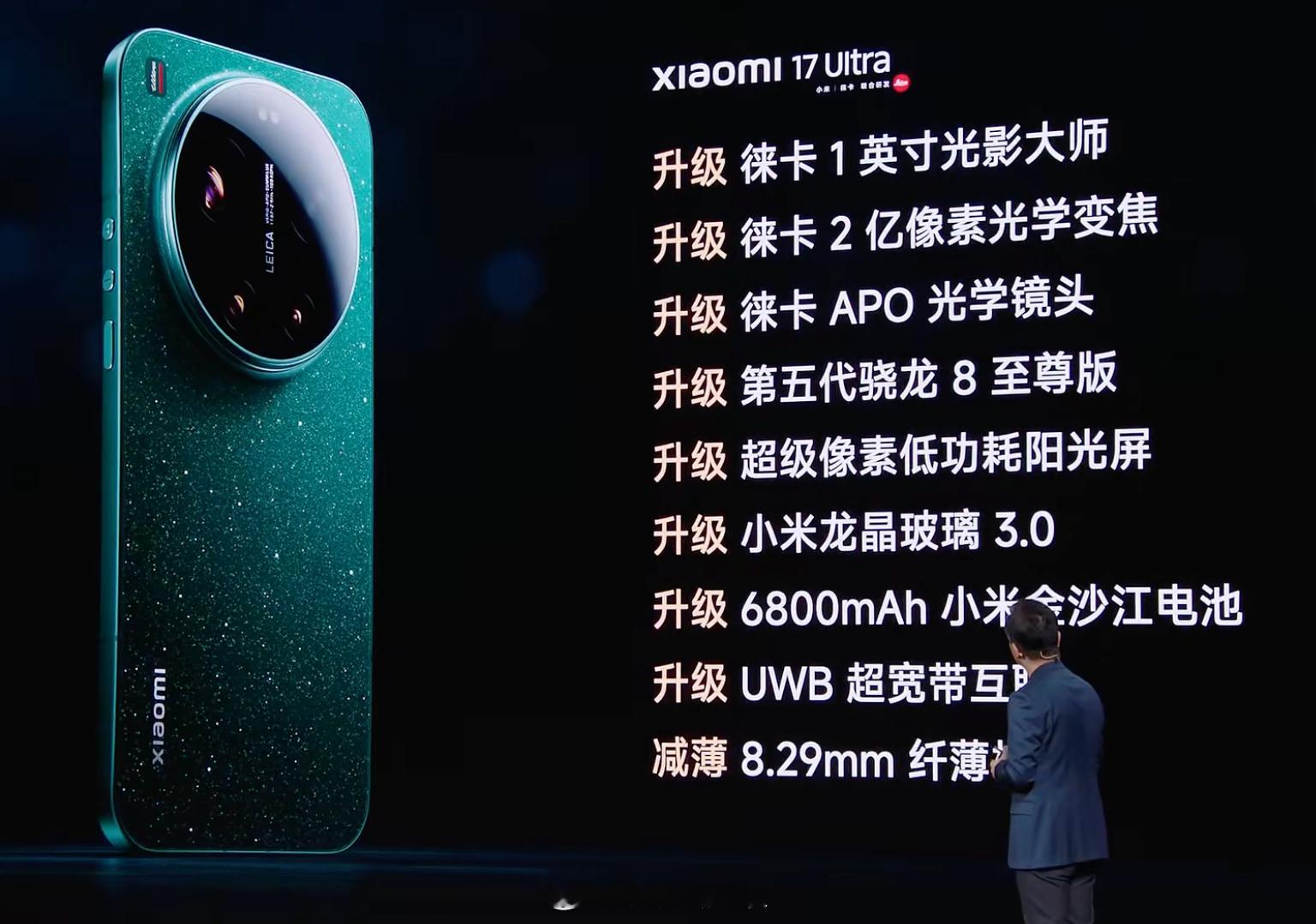 小米17 Ultra发布主摄|徕卡 1 英寸光影大师长焦|徕卡 2 亿像素光学变焦75mm-100mm焦段51个4G+5G 频段6.9英寸超窄四等边直屏第五代骁龙8至尊版龙晶玻璃3.06800mAh小米金沙江电池90W有线充电+50W无线充电烟花模式,红毯模式,超清夜景模式12+512GB 6999元16+512GB 7499元16+1TB 8499元 小米发布会