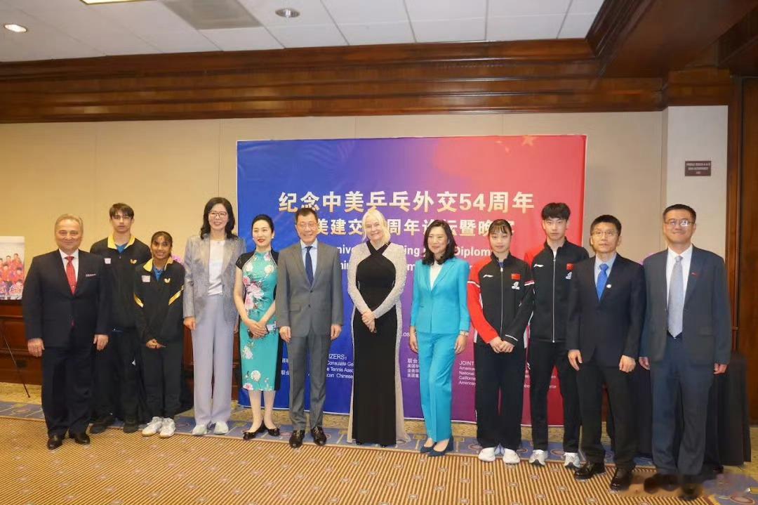 【中美乒乓建交54周年】中美乒乓外交54周年郎平现身中美乒乓外交论坛 当地时间22日晚,纪念中美乒乓外交54周年晚宴暨晚宴在洛杉矶隆重举行;众多体育名人出席,其中包括前中国美国女排主教练郎平、国际乒联主席索林,美国乒协首席执官沈伟妮、美国乒乓球教练高军,还有中国驻洛杉矶总领事郭少春大使及夫人王薇等等;晚会现场:美国奥委会国际关系部主任克罗斯兰给中国乒协颁发“中美“乒乓外交”贡献奖!
