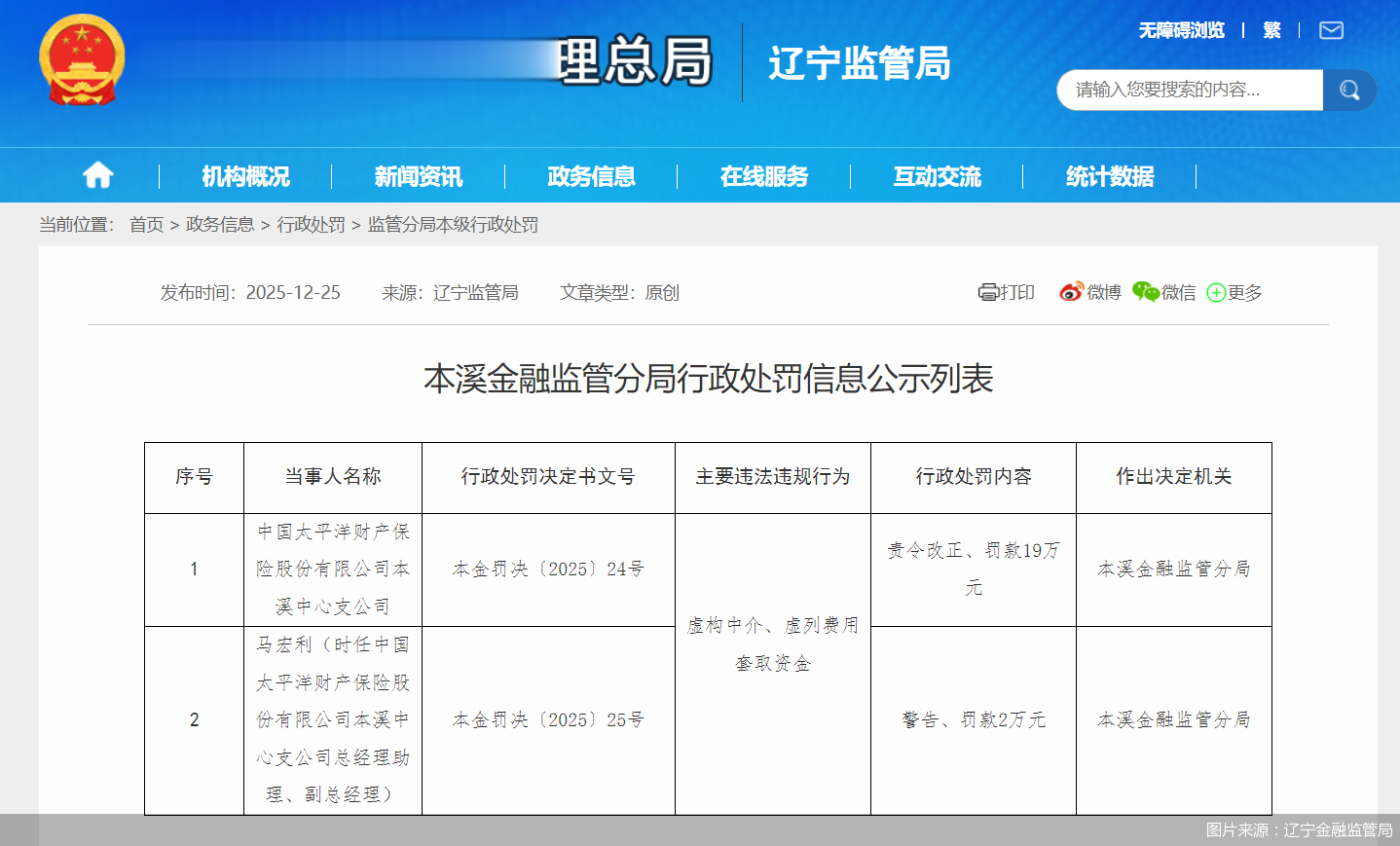 北京商报讯(记者李秀梅)12月25日,辽宁金融监管局发布行政处罚信息显示,中国太平洋财产保险股份有限公司本溪中心支公司,因虚构中介、虚列费用套取资金,被责令改正、罚款19万元。时任中国太平洋财产保险股份有限公司本溪中心支公司总经理助理、副总经理马宏利,被警告并罚款2万元。